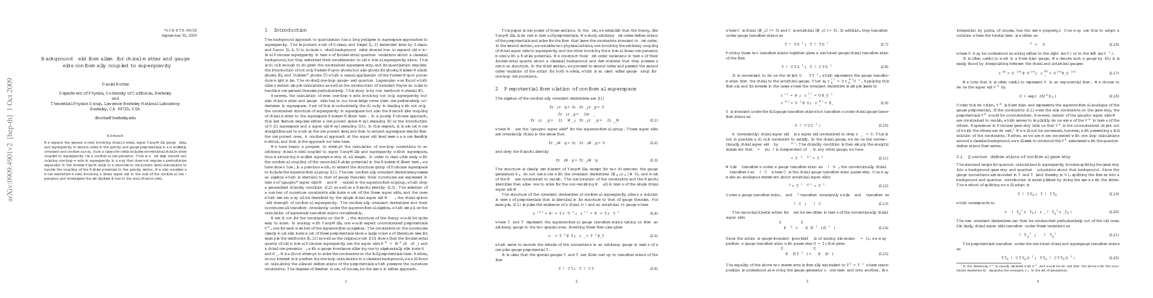 We expand the generic model involving chiral matter, super Yang-Mills gauge fields, and supergravity to second order in the gravity and gauge prepotentials in a manifestly covariant and conformal way. Such a class of models includes conventional chiral matter coupled to supergravity via a conformal compensator. This is a first step toward calculating one-loop effects in supergravity in a way that does not require a perturbative expansion in the inverse Planck scale or a recourse to component level calculations to handle the coupling of the K\"ahler potential to the gravity sector. We also consider a more restrictive model involving a linear superfield in the role of the conformal compensator and investigate the similarities it has to the dual chiral model.
