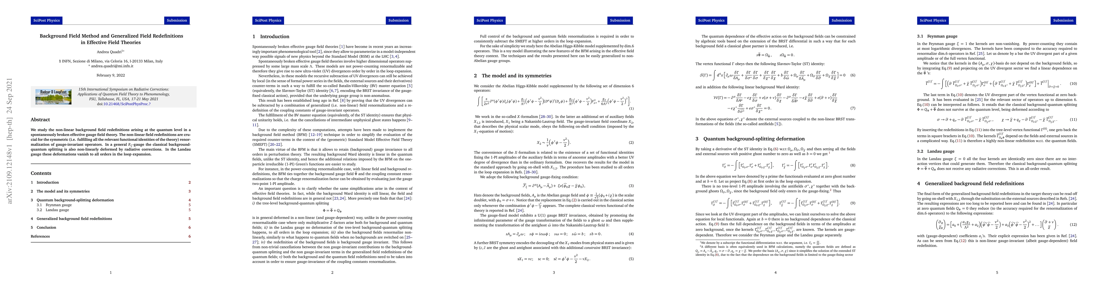 We study the non-linear background field redefinitions arising at the quantum level in a spontaneously broken effective gauge field theory. The non-linear field redefinitions are crucial for the symmetric (i.e. fulfilling all the relevant functional identities of the theory) renormalization of gauge-invariant operators. In a general $R_\xi$-gauge the classical background-quantum splitting is also non-linearly deformed by radiative corrections. In the Landau gauge these deformations vanish to all orders in the loop expansion.