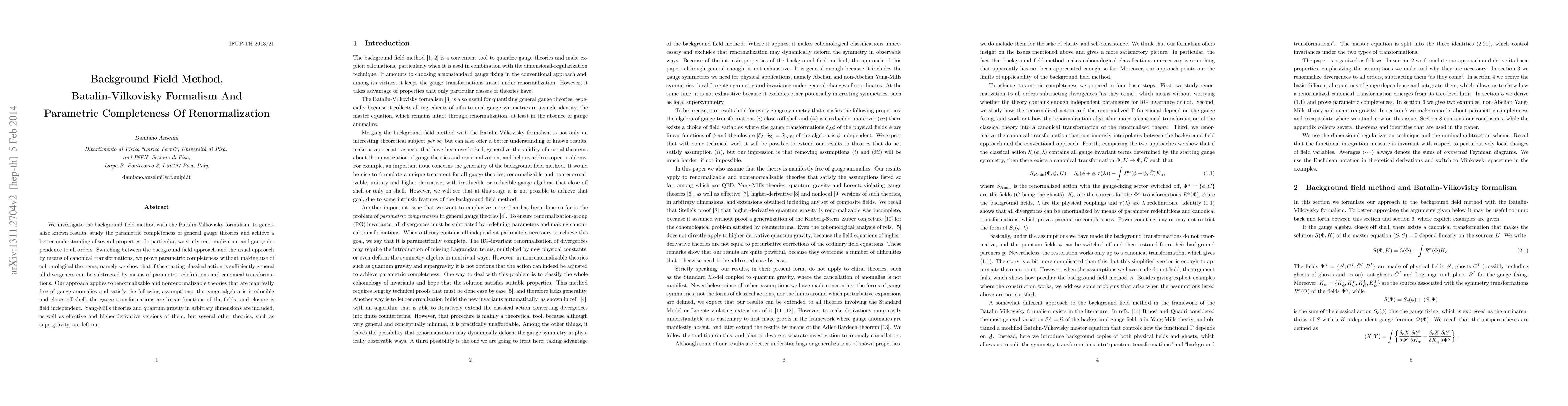 We investigate the background field method with the Batalin-Vilkovisky formalism, to generalize known results, study parametric completeness and achieve a better understanding of several properties. In particular, we study renormalization and gauge dependence to all orders. Switching between the background field approach and the usual approach by means of canonical transformations, we prove parametric completeness without making use of cohomological theorems, namely show that if the starting classical action is sufficiently general all divergences can be subtracted by means of parameter redefinitions and canonical transformations. Our approach applies to renormalizable and non-renormalizable theories that are manifestly free of gauge anomalies and satisfy the following assumptions: the gauge algebra is irreducible and closes off shell, the gauge transformations are linear functions of the fields, and closure is field-independent. Yang-Mills theories and quantum gravity in arbitrary dimensions are included, as well as effective and higher-derivative versions of them, but several other theories, such as supergravity, are left out.
