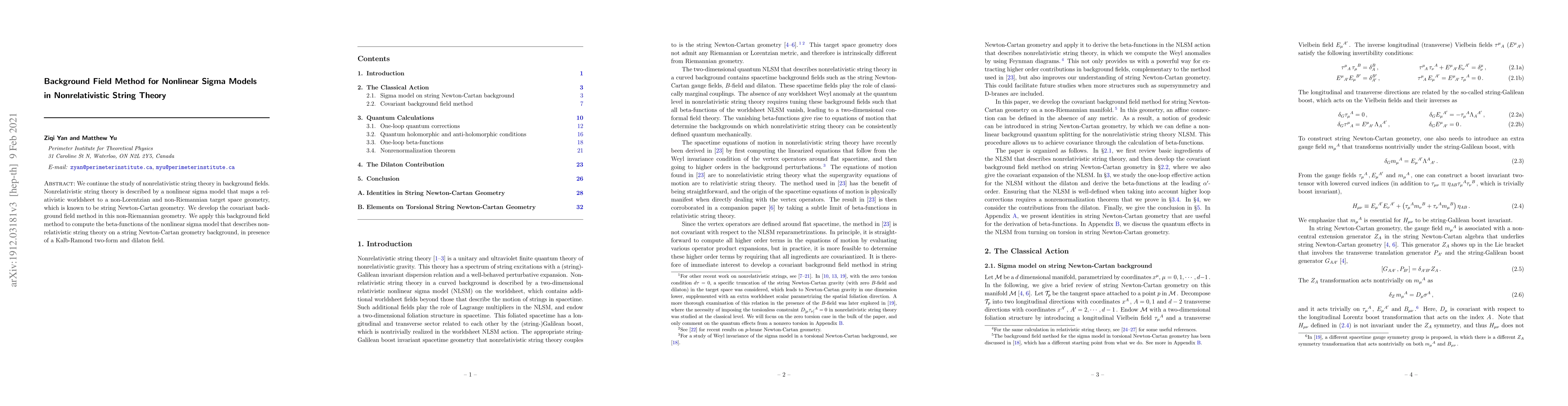 This paper develops the covariant background field method for nonlinear sigma models in nonrelativistic string theory, specifically within string Newton-Cartan geometry. It computes the beta-functions of the model, accounting for Kalb-Ramond two-form and dilaton fields in the background.