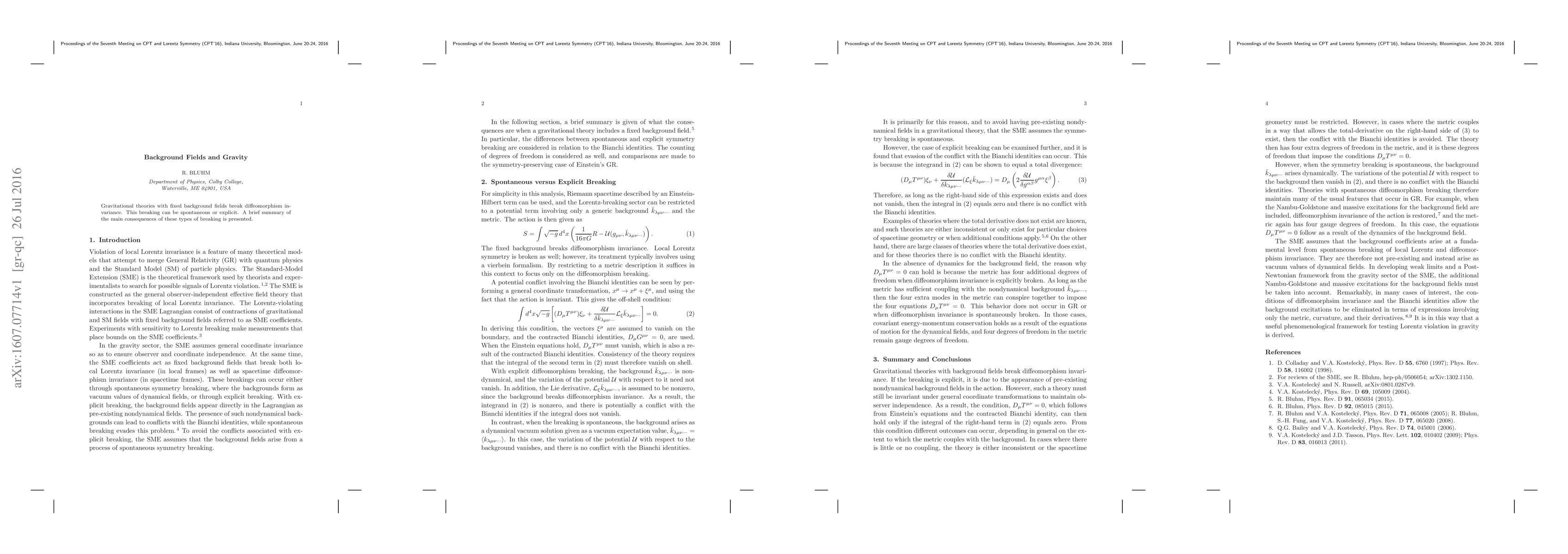 The research discusses gravitational theories with fixed background fields, analyzing the consequences of spontaneous or explicit breaking of diffeomorphism invariance, with a focus on the Standard-Model Extension (SME) framework.