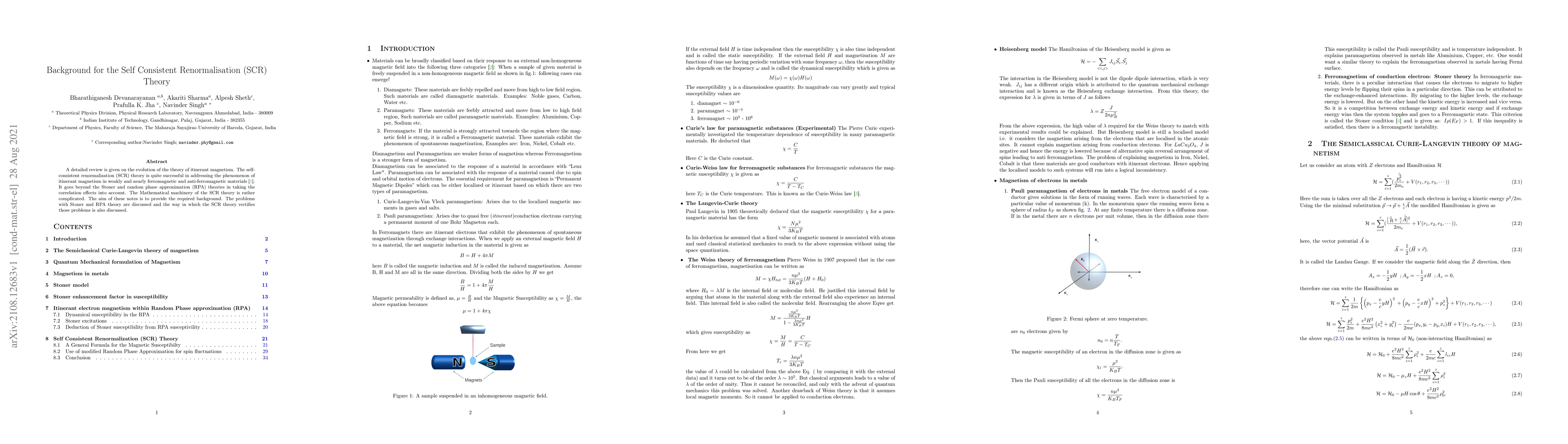 A detailed review is given on the evolution of the theory of itinerant magnetism. The self-consistent renormalization (SCR) theory is quite successful in addressing the phenomenon of itinerant magnetism in weakly and nearly ferromagnetic and anti-ferromagnetic materials. It goes beyond the Stoner and random phase approximation (RPA) theories in taking the correlation effects into account. The Mathematical machinery of the SCR theory is rather complicated. The aim of these notes is to provide the required background. The problems with Stoner and RPA theory are discussed and the way in which the SCR theory rectifies those problems is also discussed.