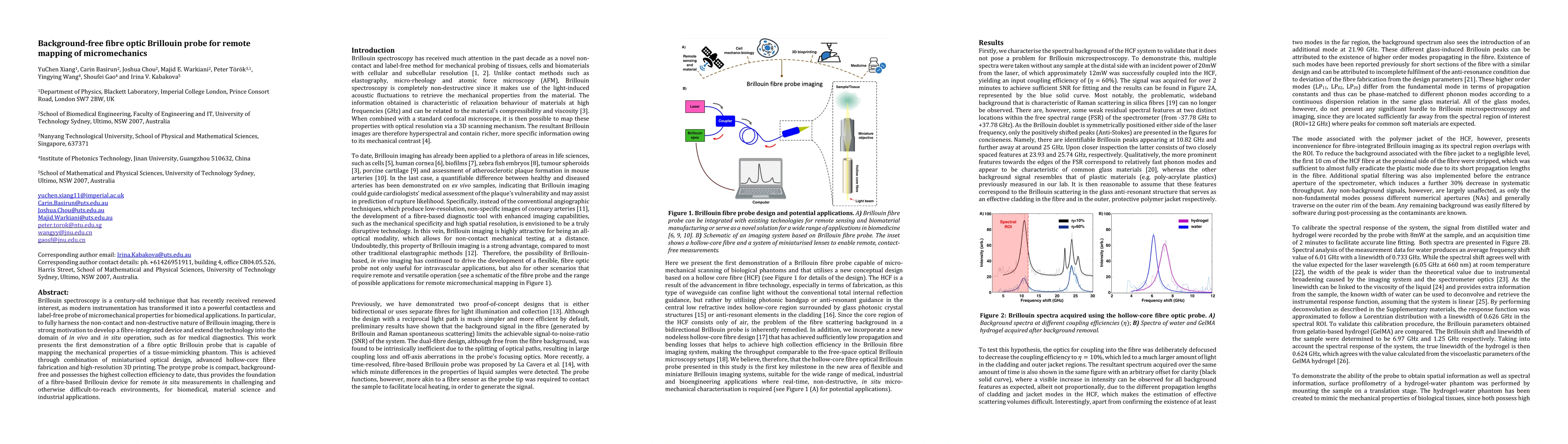 This paper demonstrates the first background-free fibre optic Brillouin probe for contactless mapping of micromechanics, combining miniaturised optical design and advanced fabrication to achieve high collection efficiency. The compact prototype enables remote in situ measurements in challenging environments for biomedical and industrial applications.