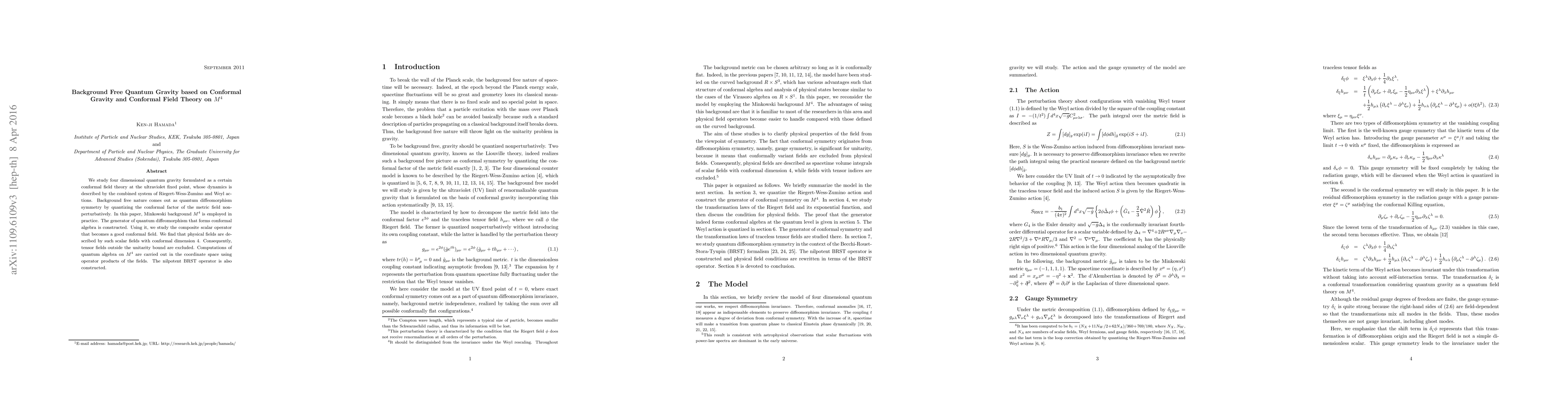 This paper explores four-dimensional quantum gravity through conformal field theory, revealing a background-free nature via quantum diffeomorphism symmetry. It constructs the generator of quantum diffeomorphism and finds that physical fields are described by composite scalar operators with conformal dimension 4, excluding tensor fields outside the unitarity bound.