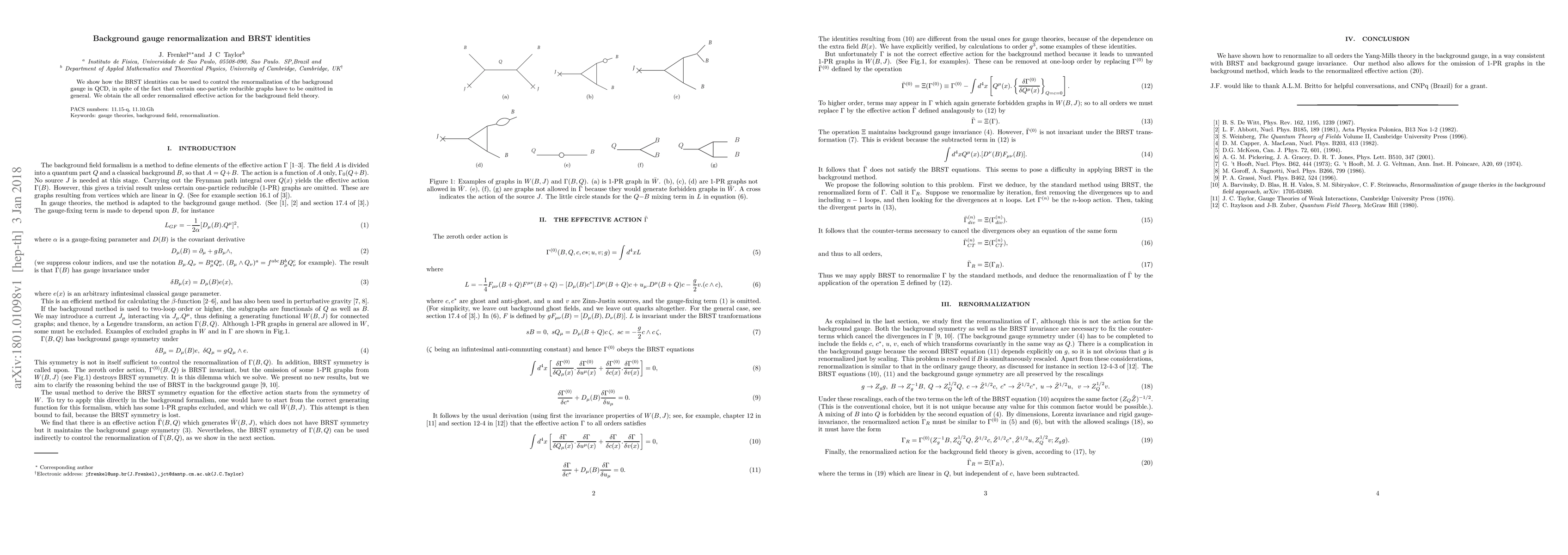 This paper demonstrates the use of BRST identities to manage the renormalization of background gauge fields in QCD, despite excluding one-particle reducible graphs, and derives the all-order renormalized effective action for background field theory.