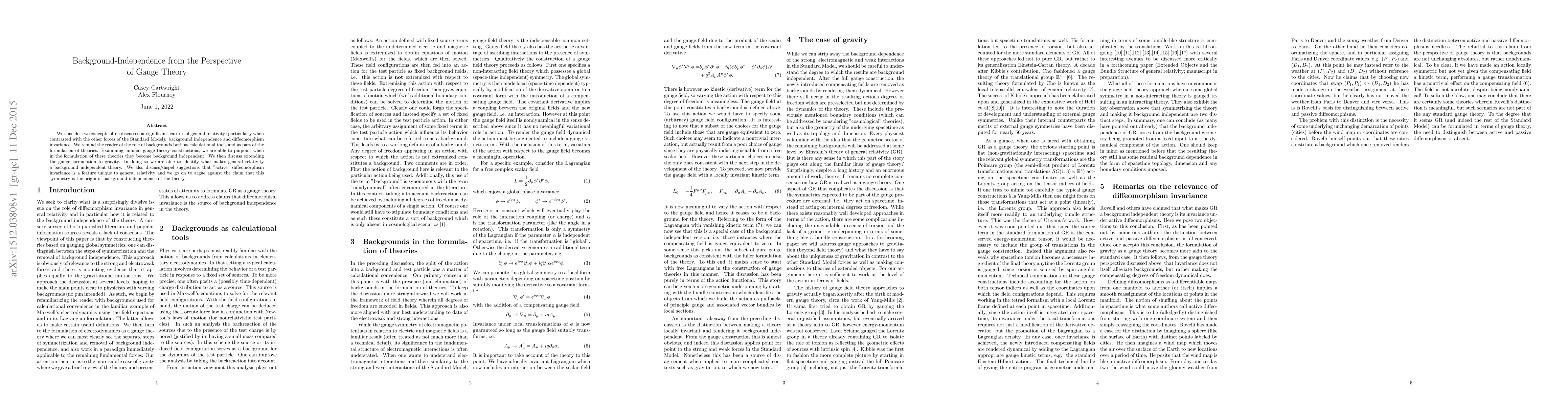 We consider two concepts often discussed as significant features of general relativity (particularly when contrasted with the other forces of the Standard Model): background independence and diffeomorphism invariance. We remind the reader of the role of backgrounds both as calculational tools and as part of the formulation of theories. Examining familiar gauge theory constructions, we are able to pinpoint when in the formulation of these theories they become background independent. We then discuss extending the gauge formulation to gravity. In doing so we are able to identify what makes general relativity a background independent theory. We also discuss/dispel suggestions that "active" diffeomorphism invariance is a feature unique to general relativity and we go on to argue against the claim that this symmetry is the origin of background independence of the theory.