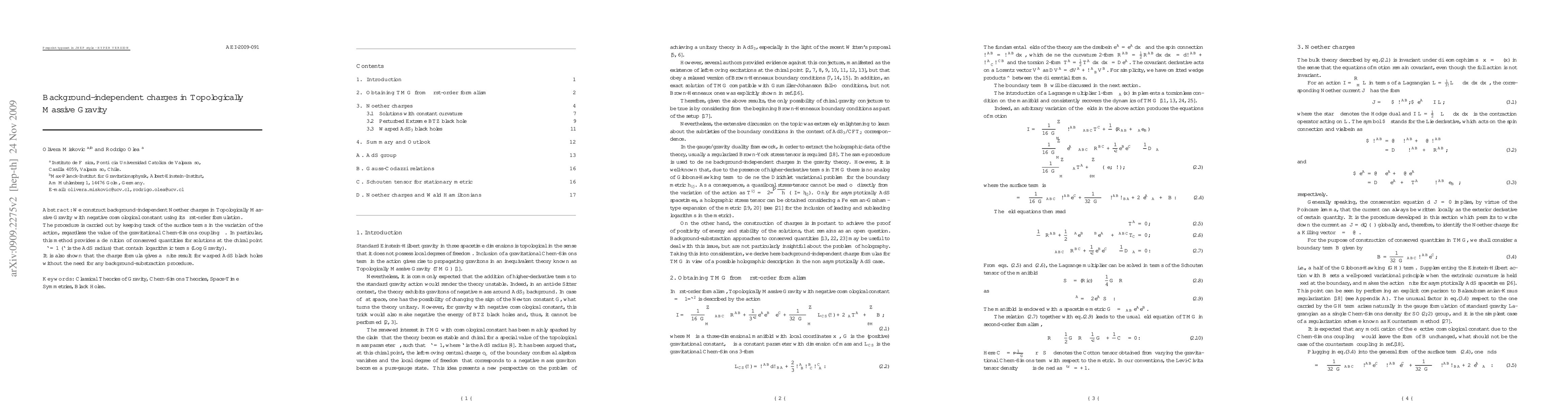 This paper constructs background-independent Noether charges in Topologically Massive Gravity, focusing on solutions with negative cosmological constant and including Log Gravity. The method yields finite conserved quantities for warped AdS black holes without background subtraction.