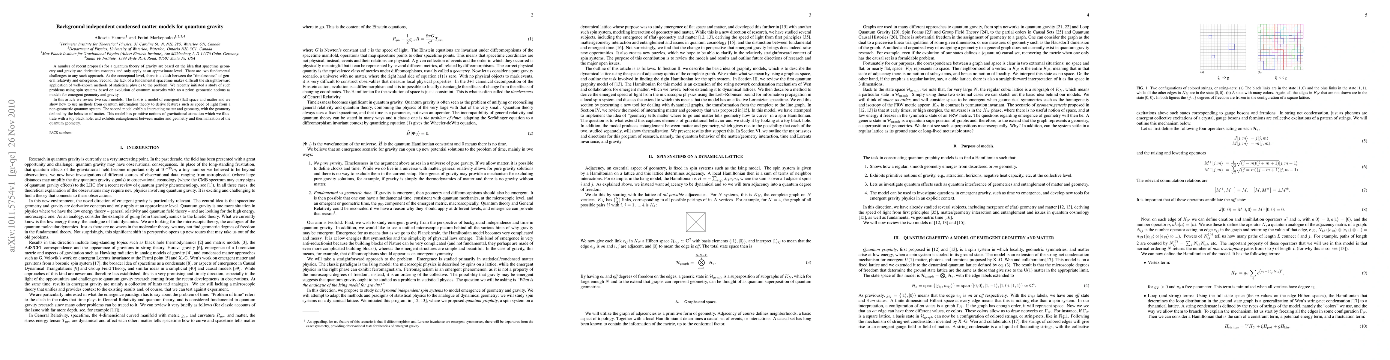 This paper reviews two background-independent condensed matter models for quantum gravity, where spacetime geometry emerges from quantum networks. The first model demonstrates emergent flat space and matter using quantum information theory. The second model shows interacting matter and geometry, with primitive gravitational effects illustrated by a toy black hole, and exhibits entanglement and thermalization.
