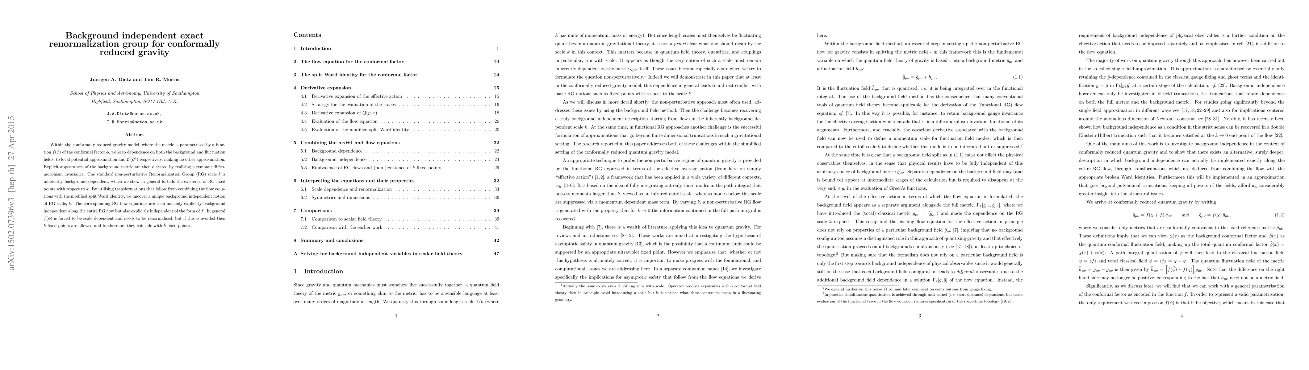 Within the conformally reduced gravity model, where the metric is parametrised by a function $f(\phi)$ of the conformal factor $\phi$, we keep dependence on both the background and fluctuation fields, to local potential approximation and $\mathcal{O}(\partial^2)$ respectively, making no other approximation. Explicit appearances of the background metric are then dictated by realising a remnant diffeomorphism invariance. The standard non-perturbative Renormalization Group (RG) scale $k$ is inherently background dependent, which we show in general forbids the existence of RG fixed points with respect to $k$. By utilising transformations that follow from combining the flow equations with the modified split Ward identity, we uncover a unique background independent notion of RG scale, $\hat k$. The corresponding RG flow equations are then not only explicitly background independent along the entire RG flow but also explicitly independent of the form of $f$. In general $f(\phi)$ is forced to be scale dependent and needs to be renormalised, but if this is avoided then $k$-fixed points are allowed and furthermore they coincide with $\hat k$-fixed points.
