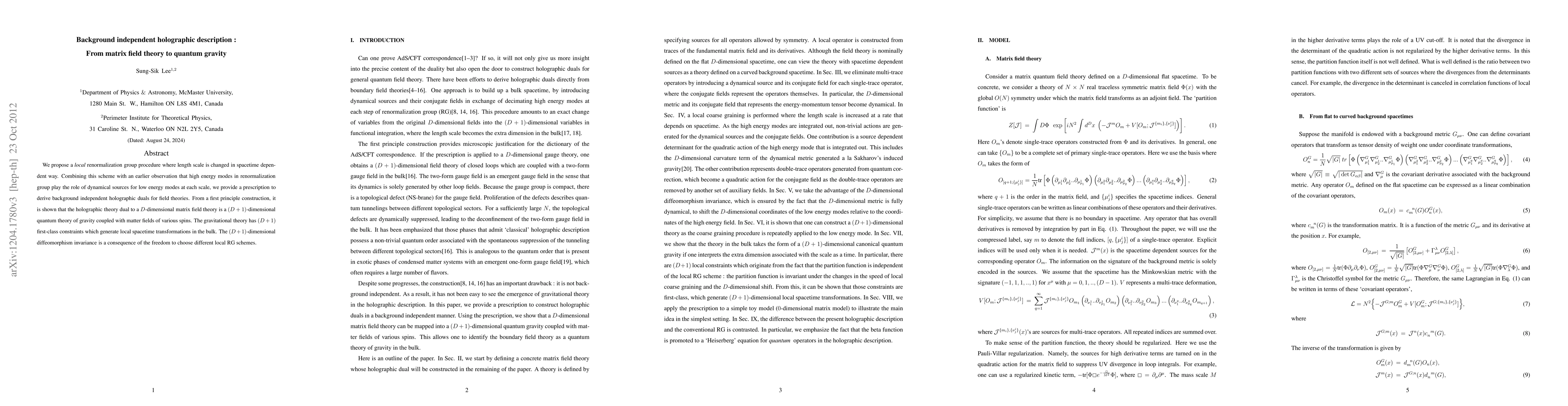 This research proposes a method to derive background-independent holographic duals for field theories by combining local renormalization group procedures with earlier observations. It successfully constructs a (D+1)-dimensional quantum theory of gravity coupled with matter fields from D-dimensional matrix field theories.