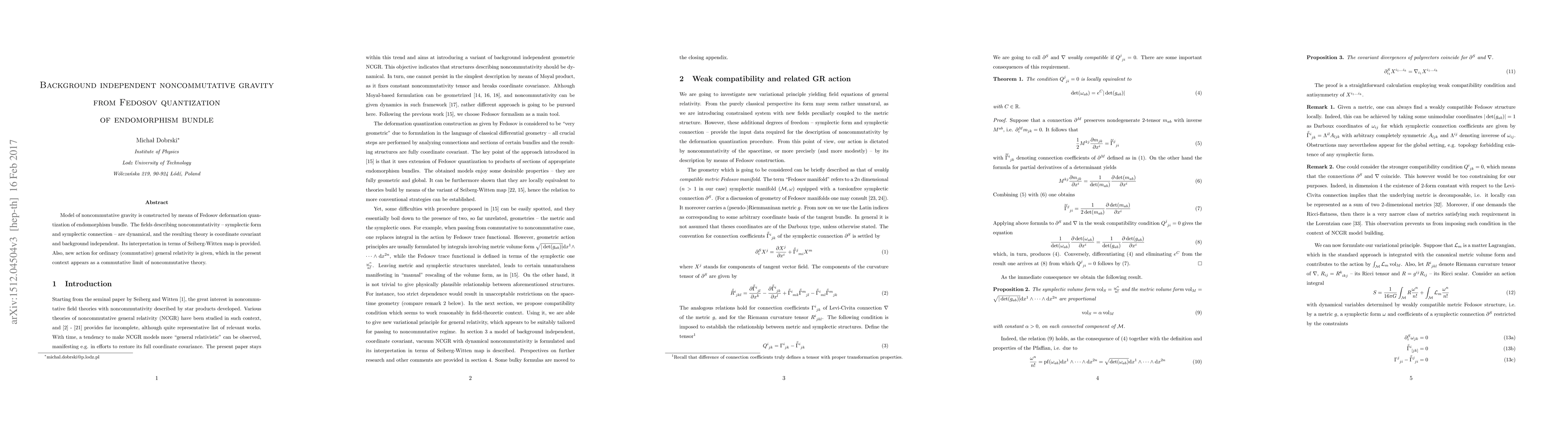 This paper constructs a background-independent model of noncommutative gravity through Fedosov quantization of an endomorphism bundle, making the symplectic form and connection dynamical. It provides a Seiberg-Witten map interpretation and derives a new action for ordinary general relativity as the commutative limit of the noncommutative theory.