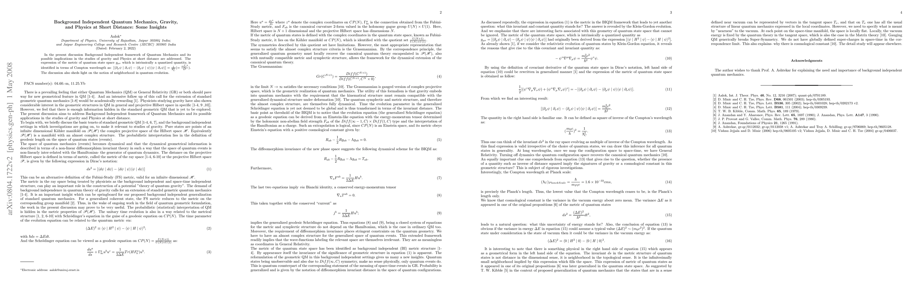 In the present discussion Background Independent framework of Quantum Mechanics and its possible implications in the studies of gravity and Physics at short distance are addressed. The expression of the metric of quantum state space $g_{\mu\nu}$ which is intrinsically a quantized quantity, is identified in terms of Compton wavelength as: $[<\partial_\mu\psi\mid\partial_\nu\psi> - <\partial_\mu\psi\mid\psi> <\psi\mid\partial_\nu\psi>] = 1 / \lambdabar_C^2 (=m_0^2c^2 / \hbar^2})$. The discussion also sheds light on the notion of neighborhood in quantum evolution, and various constraints on the possibilities of smallness of distance in the quantum mechanical limits.