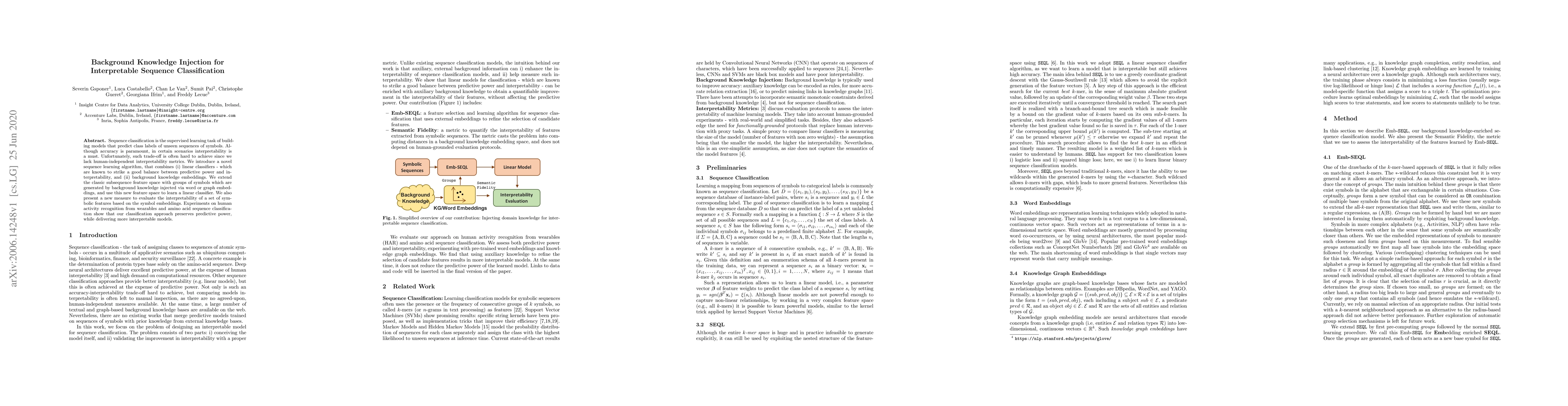This paper proposes a sequence classification method that combines linear classifiers with background knowledge embeddings to improve interpretability while maintaining predictive accuracy. The method uses enriched feature spaces from injected knowledge and presents a new interpretability measure, demonstrating effectiveness in human activity and amino acid sequence classification tasks.
