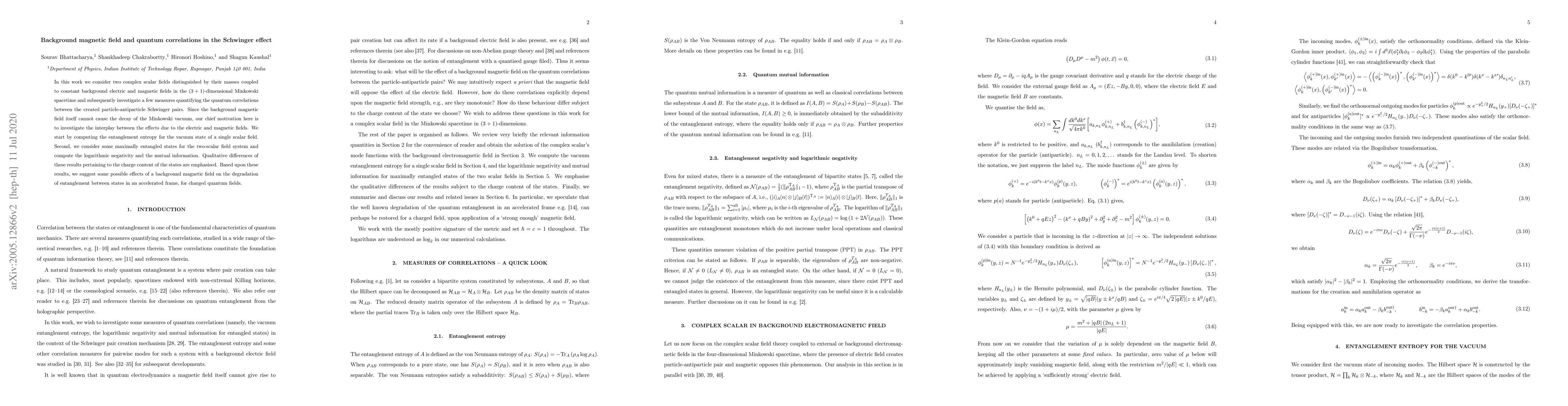 Researchers investigated how background magnetic fields affect quantum correlations in particle-antiparticle pairs created through a process known as the Schwinger effect, finding qualitative differences in entanglement between states with varying charge content.