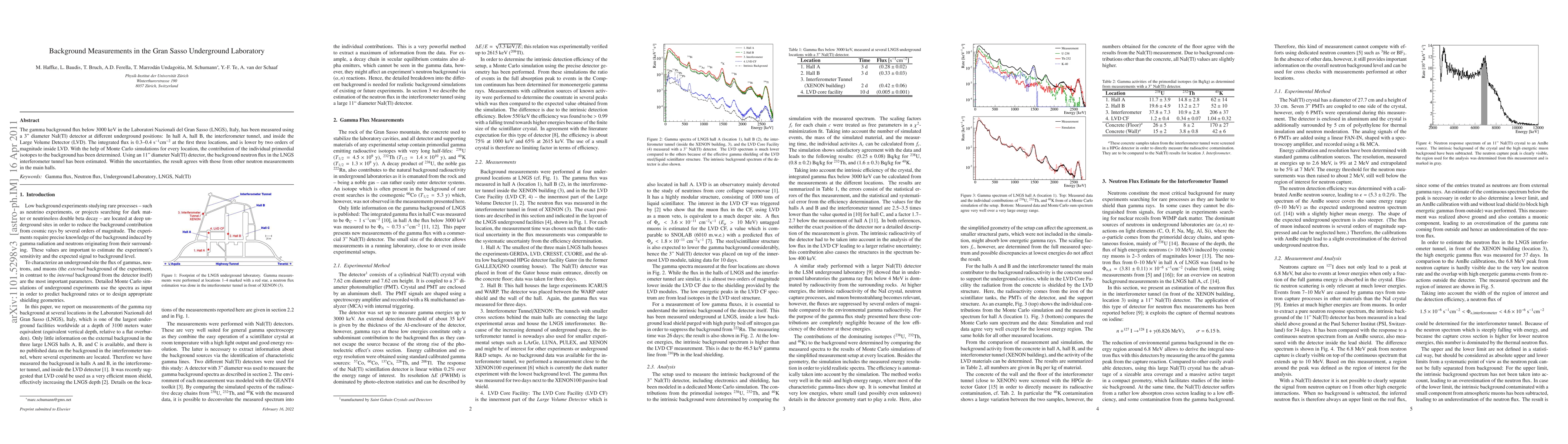 This study measures the gamma background flux in various locations at the Gran Sasso Underground Laboratory using NaI(Tl) detectors, finding significantly lower levels inside the Large Volume Detector. Monte Carlo simulations identify contributions from primordial isotopes, and neutron flux measurements in the interferometer tunnel are consistent with other results.