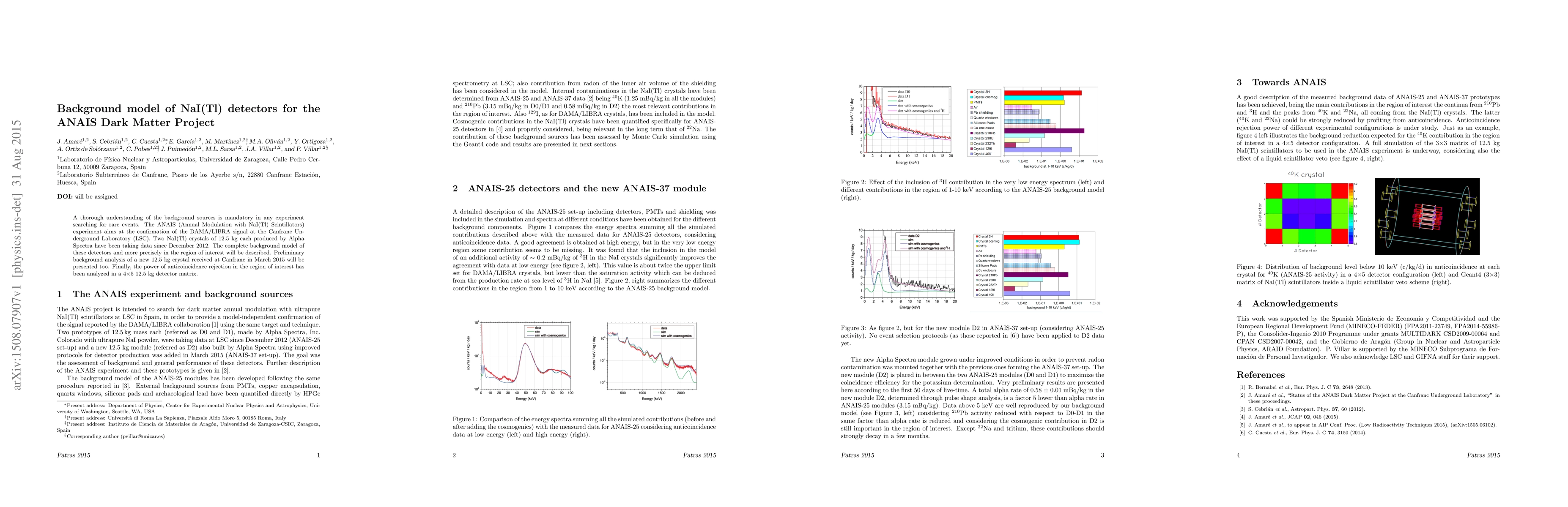 The ANAIS experiment aims to confirm the DAMA/LIBRA dark matter signal using NaI(Tl) detectors, detailing their background sources and preliminary analysis of new crystals. The study also evaluates the effectiveness of anticoincidence rejection in a larger detector matrix.