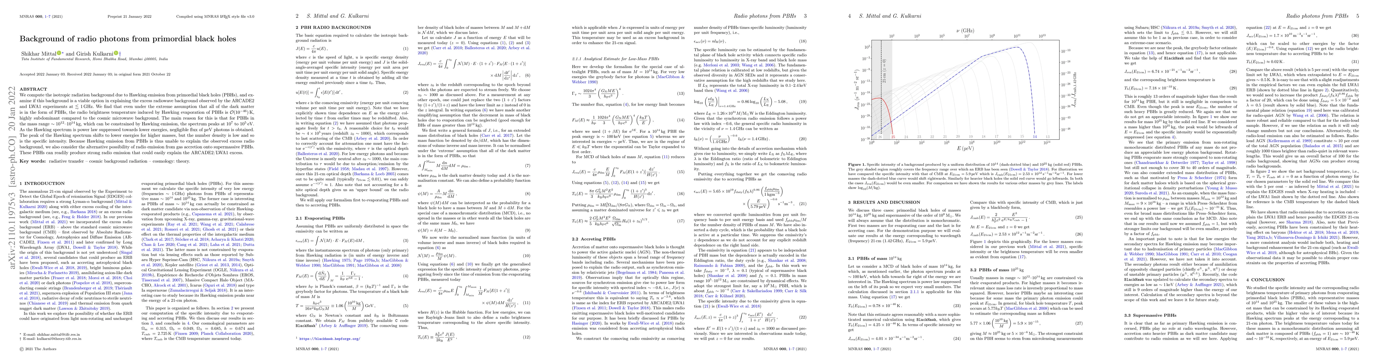 This paper investigates whether Hawking radiation from primordial black holes (PBHs) could account for the observed excess radiowave background at $\lesssim 1\,$GHz. It concludes that Hawking emission from PBHs is too weak to explain this excess, as the emitted spectrum peaks at much higher energies. The paper then explores radio emission from gas accretion onto supermassive PBHs as a more viable alternative.