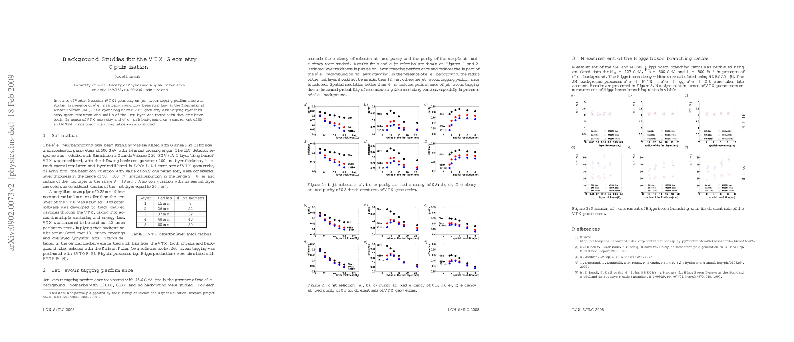 Influence of Vertex Detector (VTX) geometry on jet flavour tagging performance was studied in presence of e+e- pair background from beamstrahlung in the International Linear Collider (ILC). Five layer "long-barrel" VTX geometry with varying layer thickness, space resolution and radius of the first layer was tested with fast simulation tools. Influence of VTX geometry and e+e- pair background on measurement of SM and MSSM Higgs boson branching ratios was also studied.