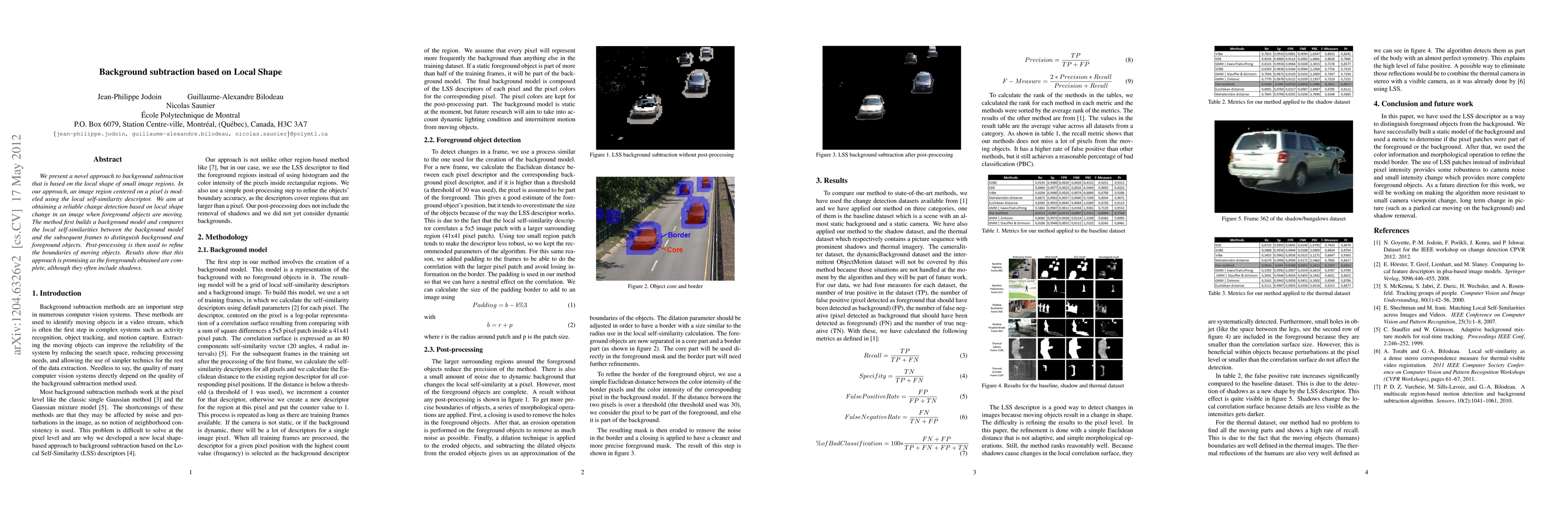 We present a novel approach to background subtraction that is based on the local shape of small image regions. In our approach, an image region centered on a pixel is mod-eled using the local self-similarity descriptor. We aim at obtaining a reliable change detection based on local shape change in an image when foreground objects are moving. The method first builds a background model and compares the local self-similarities between the background model and the subsequent frames to distinguish background and foreground objects. Post-processing is then used to refine the boundaries of moving objects. Results show that this approach is promising as the foregrounds obtained are com-plete, although they often include shadows.