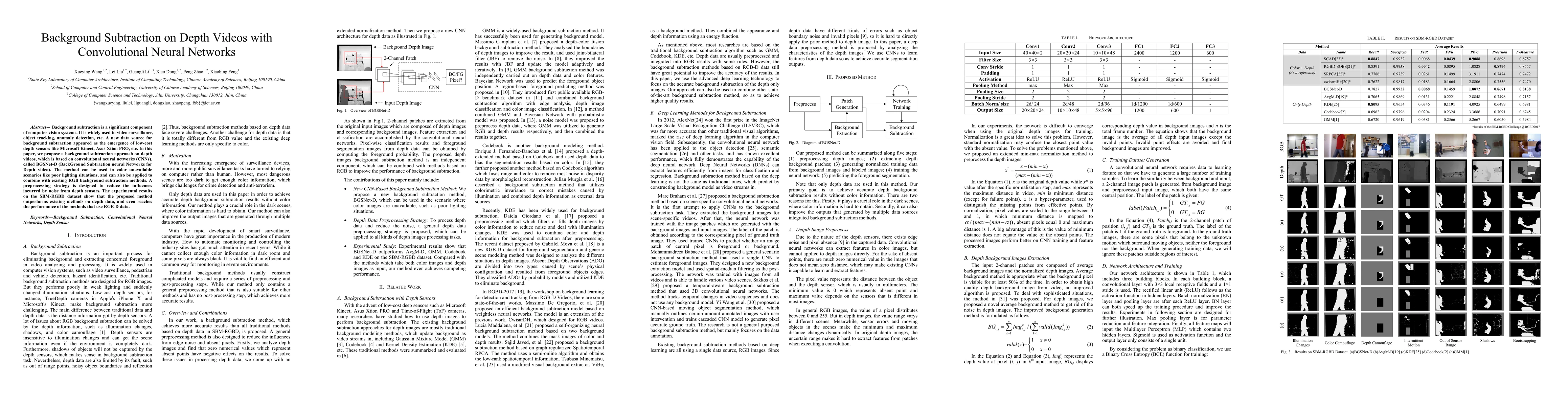 This paper proposes BGSNet-D, a convolutional neural network-based approach for background subtraction on depth videos, which is effective in poor lighting and can complement existing RGB methods. The method includes a preprocessing strategy to mitigate depth sensor noise, outperforming existing techniques on the SBM-RGBD dataset.