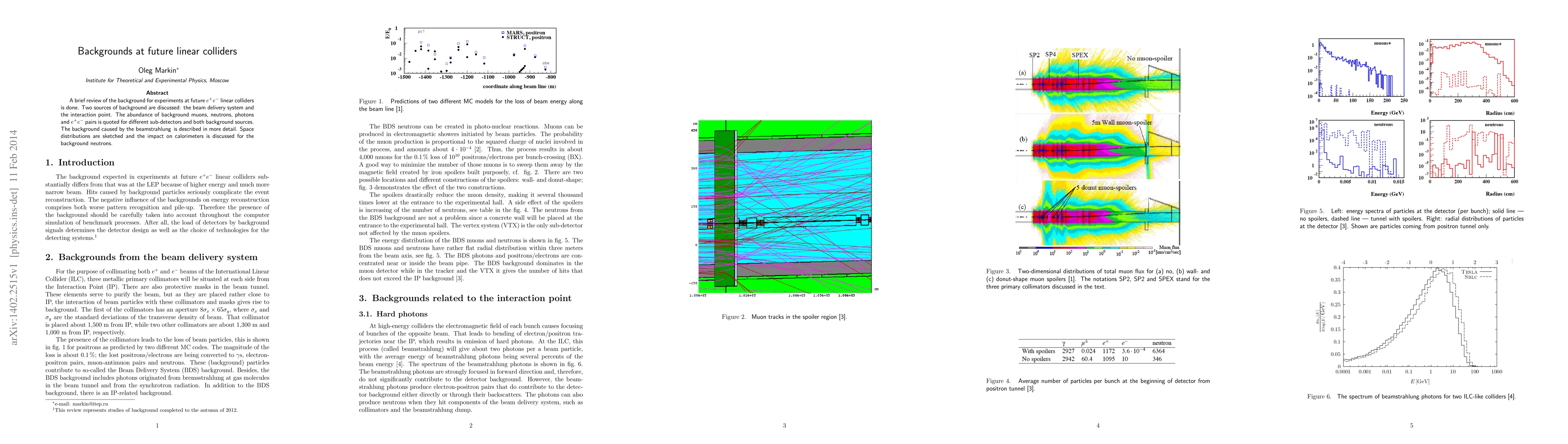 This paper reviews background sources for future linear electron-positron collider experiments, focusing on beam delivery systems and interaction points. It details abundant background particles like muons, neutrons, photons, and e-p pairs, and extensively describes beamstrahlung background, including its spatial distribution and calorimeter impact.