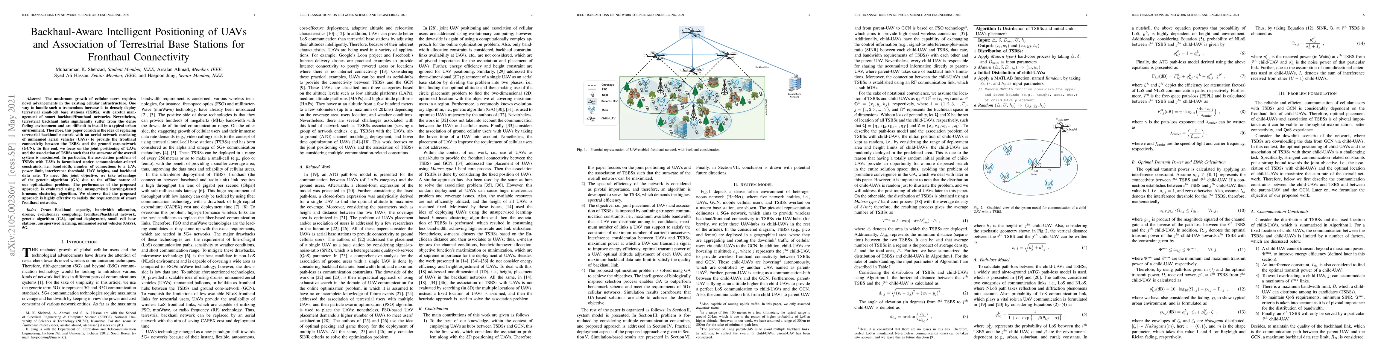 This paper proposes an intelligent positioning strategy for UAVs to replace terrestrial backhaul networks, optimizing the association of terrestrial small-cell base stations (TSBSs) with UAVs to maximize the overall system sum-rate. The genetic algorithm is employed to solve the complex optimization problem, demonstrating effective fronthaul connectivity through k-means clustering evaluation.