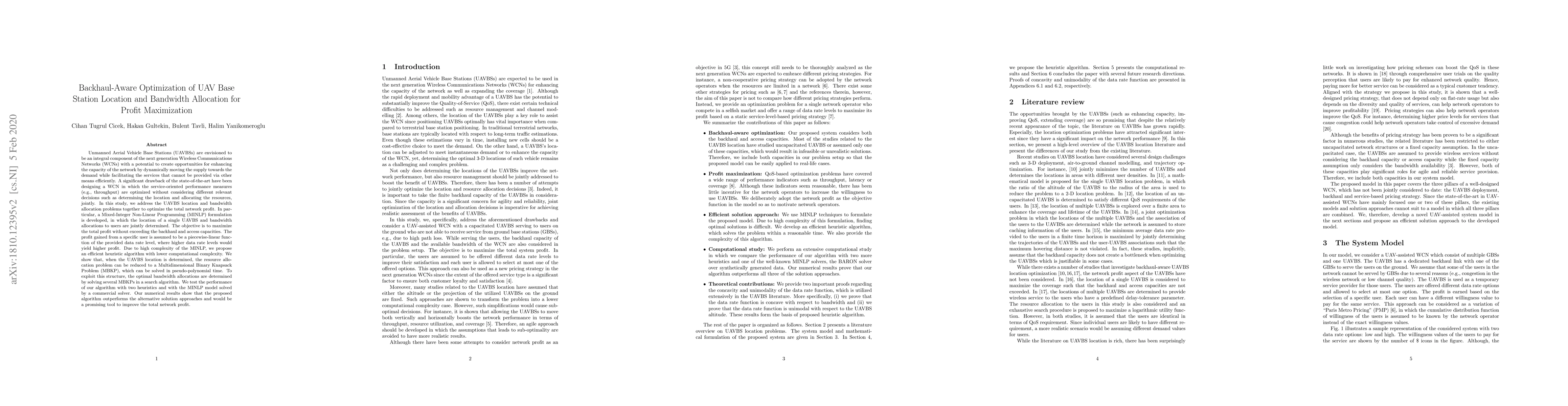 Unmanned Aerial Vehicle Base Stations (UAVBSs) are envisioned to be an integral component of the next generation Wireless Communications Networks (WCNs) by dynamically moving the supply towards the demand. A significant drawback of the state-of-the-art have been designing a WCN in which the service-oriented performance measures (e.g., throughput) are optimized without considering different relevant decisions such as determining the location and allocating the resources, jointly. In this study, we address the UAVBS location and bandwidth allocation problems together to optimize the total network profit. In particular, a Mixed-Integer Non-Linear Programming (MINLP) formulation is developed, in which the location of a single UAVBS and bandwidth allocations to users are jointly determined. The objective is to maximize the total profit without exceeding the backhaul and access capacities. The profit gained from a specific user is assumed to be a piecewise-linear function of the provided data rate level, where higher data rate levels would yield higher profit. Due to high complexity of the MINLP, we propose an efficient heuristic algorithm with lower computational complexity. We show that, when the UAVBS location is determined, the resource allocation problem can be reduced to a Multidimensional Binary Knapsack Problem (MBKP), which can be solved in pseudo-polynomial time. To exploit this structure, the optimal bandwidth allocations are determined by solving several MBKPs in a search algorithm. We test the performance of our algorithm with two heuristics and with the MINLP model solved by a commercial solver. Our numerical results show that the proposed algorithm outperforms the alternative solution approaches and would be a promising tool to improve the total network profit.