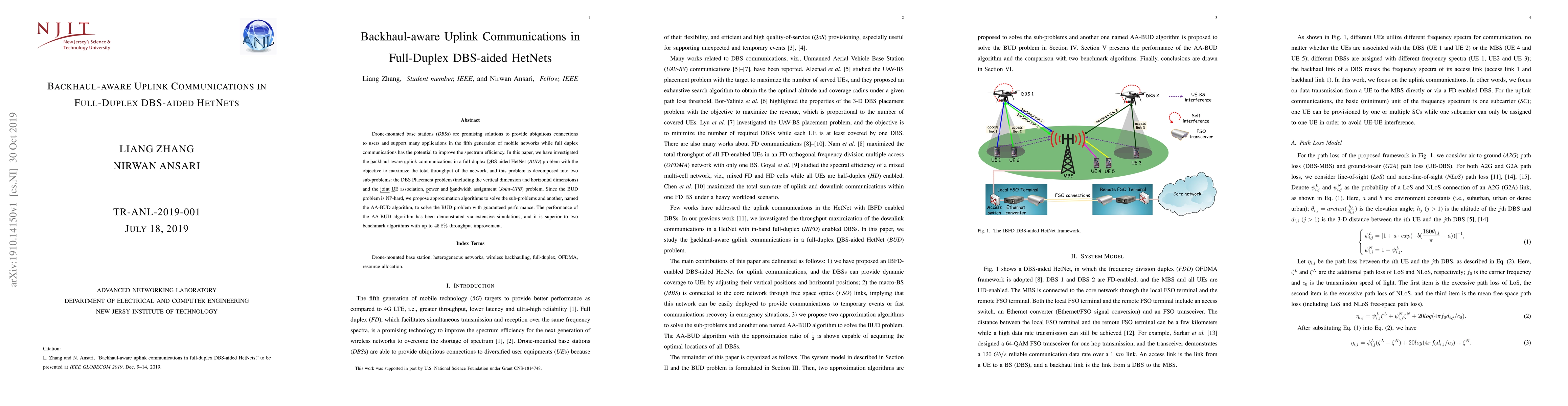Drone-mounted base stations (DBSs) are promising solutions to provide ubiquitous connections to users and support many applications in the fifth generation of mobile networks while full duplex communications has the potential to improve the spectrum efficiency. In this paper, we have investigated the backhaul-aware uplink communications in a full-duplex DBS-aided HetNet (BUD) problem with the objective to maximize the total throughput of the network, and this problem is decomposed into two sub-problems: the DBS Placement problem (including the vertical dimension and horizontal dimensions) and the joint UE association, power and bandwidth assignment (Joint-UPB) problem. Since the BUD problem is NP-hard, we propose approximation algorithms to solve the sub-problems and another, named the AA-BUD algorithm, to solve the BUD problem with guaranteed performance. The performance of the AA-BUD algorithm has been demonstrated via extensive simulations, and it is superior to two benchmark algorithms with up to 45.8% throughput improvement.