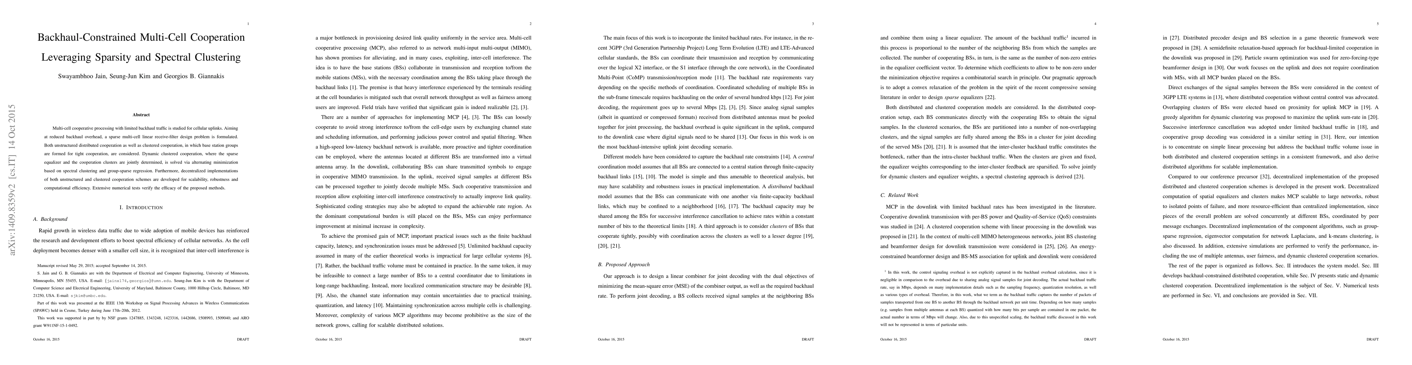 This paper proposes methods for multi-cell cooperative processing to minimize backhaul traffic in cellular uplinks, leveraging sparsity and spectral clustering. It develops dynamic clustered cooperation schemes and decentralized implementations for scalability and efficiency, validated through extensive numerical tests.