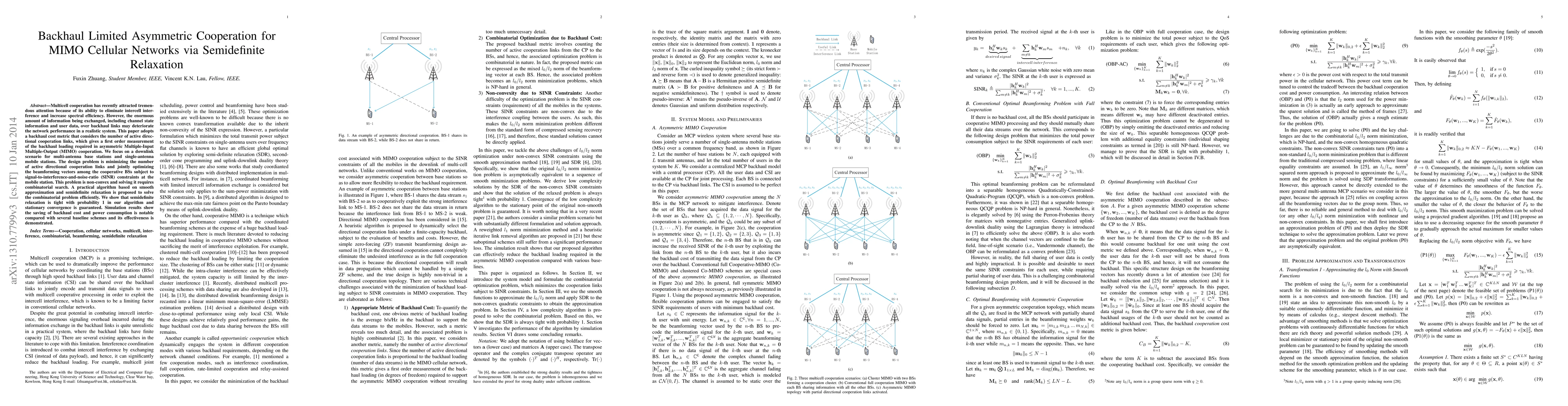 This paper proposes a semidefinite relaxation algorithm to minimize backhaul cost and power consumption in asymmetric MIMO cellular networks by optimizing the number of active directional cooperation links and beamforming vectors among cooperative base stations, achieving notable savings compared to baseline schemes. The algorithm ensures tight relaxation and convergence, demonstrating effective interference elimination and spectral efficiency.