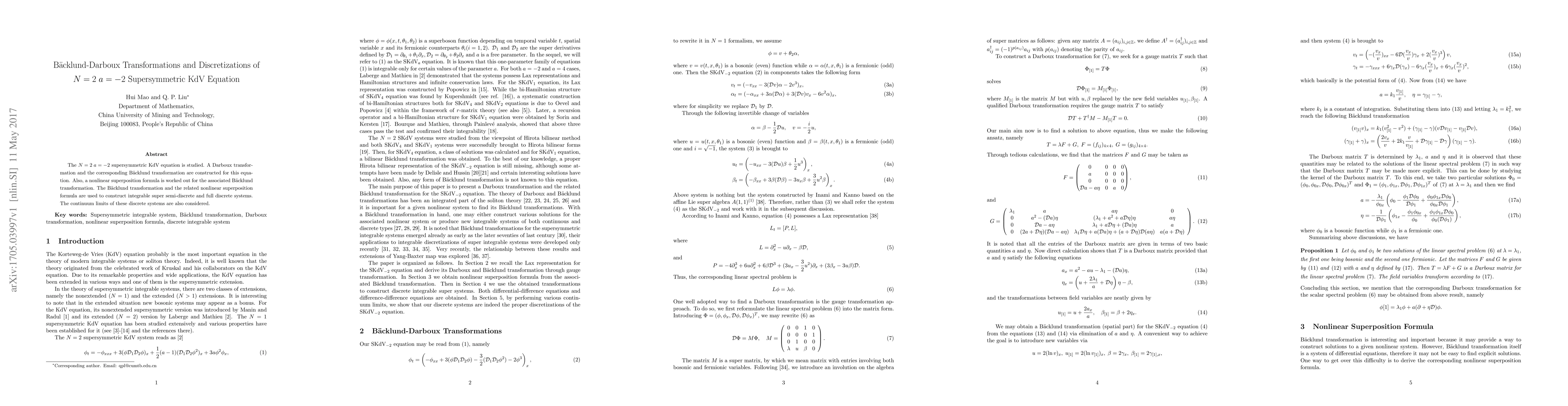 This paper constructs Darboux and Bäcklund transformations for the $N=2 \;a=-2$ supersymmetric KdV equation, develops a nonlinear superposition formula, and uses these tools to create integrable super semi-discrete and full discrete systems, with a discussion on their continuum limits.
