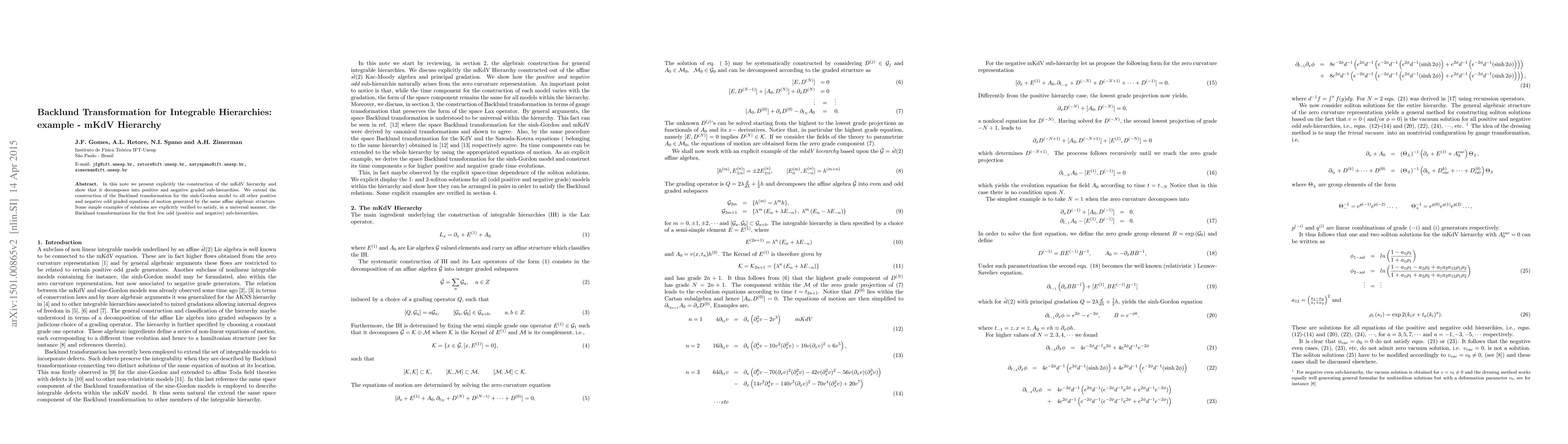 In this note we present explicitly the construction of the mKdV hierarchy and show that it decomposes into positive and negative graded sub-hierarchies. We extend the construction of the Backlund transformation for the sinh-Gordon model to all other positive and negative odd graded equations of motion generated by the same affine algebraic structure. Some simple examples of solutions are explicitly verified to satisfy, in a universal manner, the Backlund transformations for the first few odd (positive and negative) sub-hierarchies.