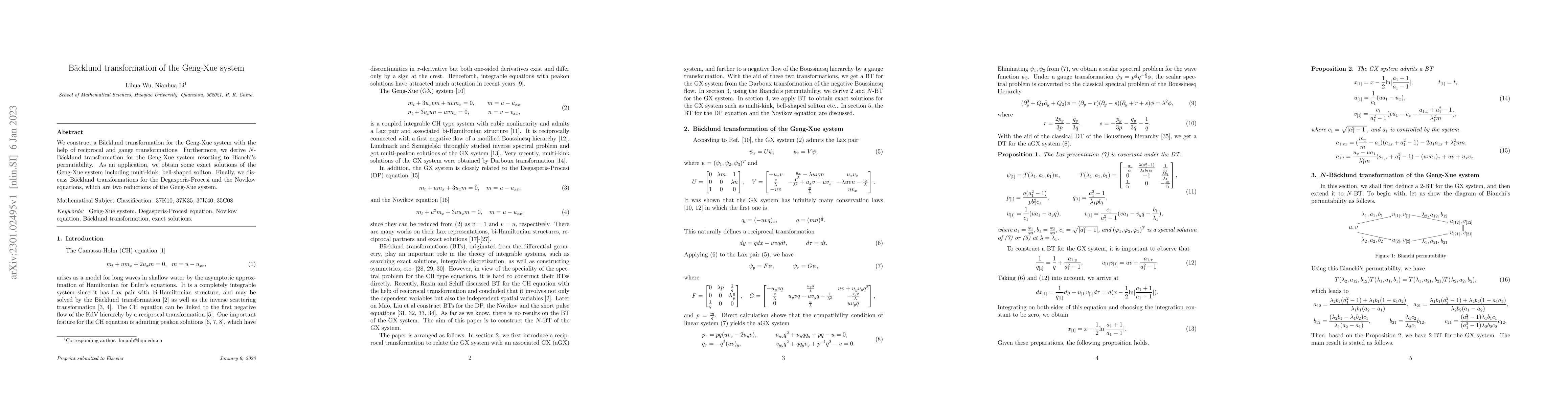This paper constructs a Backlund transformation for the Geng-Xue system using reciprocal and gauge transformations, and derives an N-Backlund transformation via Bianchi's permutability. The study also provides exact solutions, including multi-kink and bell-shaped solitons, and discusses Backlund transformations for related Degasperis-Procesi and Novikov equations.