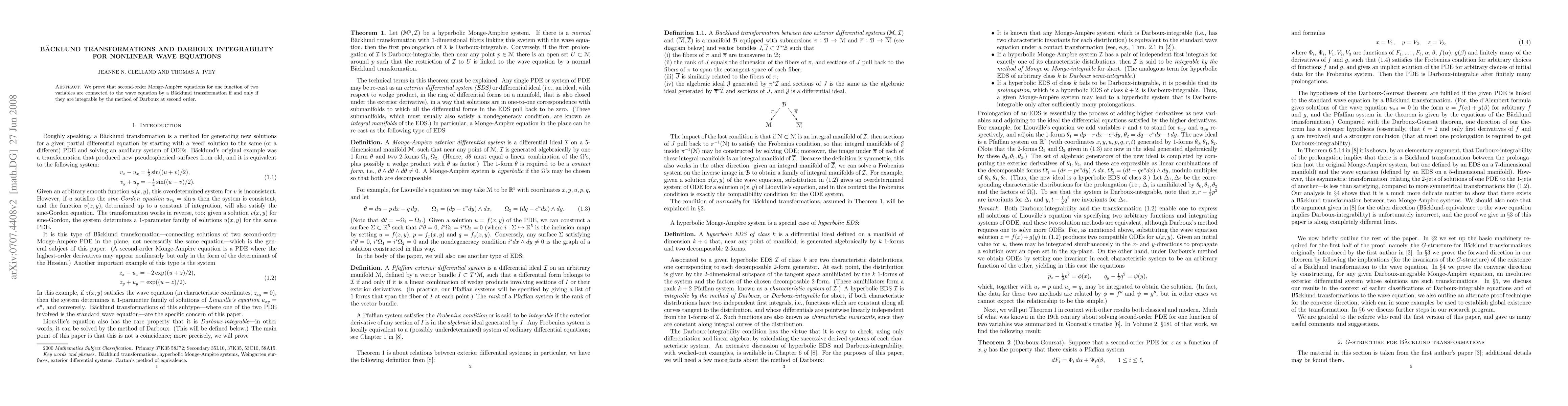Summary: The paper establishes a link between Backlund transformations and Darboux integrability for second-order hyperbolic Monge-Ampere equations, showing they are equivalent through explicit constructions and the invariants of G-structures associated with the wave equation.