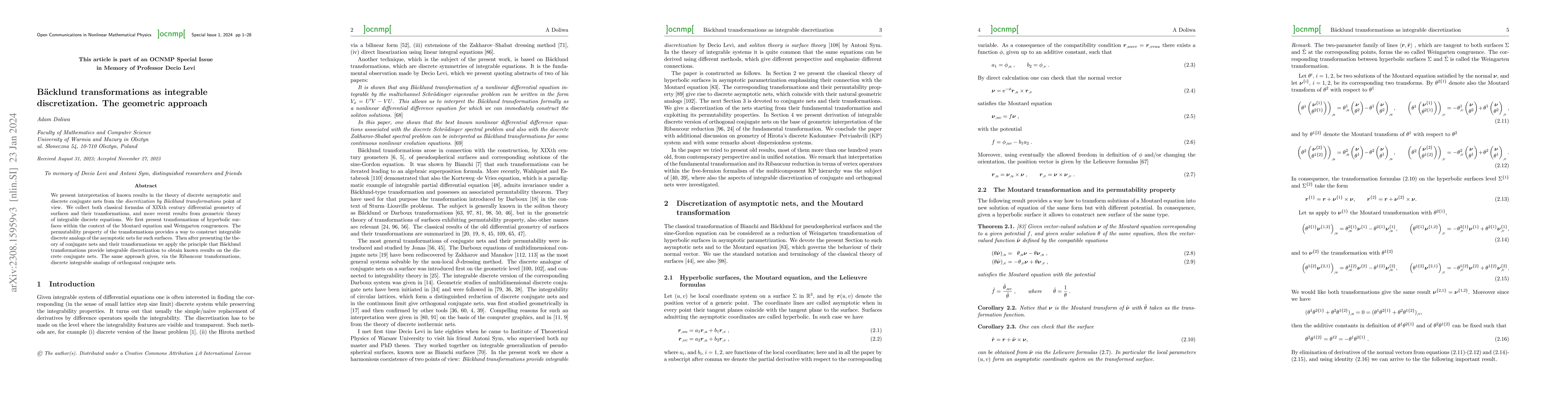 This paper interprets classical differential geometry results and recent integrable discrete equations through the lens of Bäcklund transformations, demonstrating how these transformations yield integrable discretizations of asymptotic and conjugate nets on hyperbolic surfaces, including the Moutard equation and Ribaucour transformations.