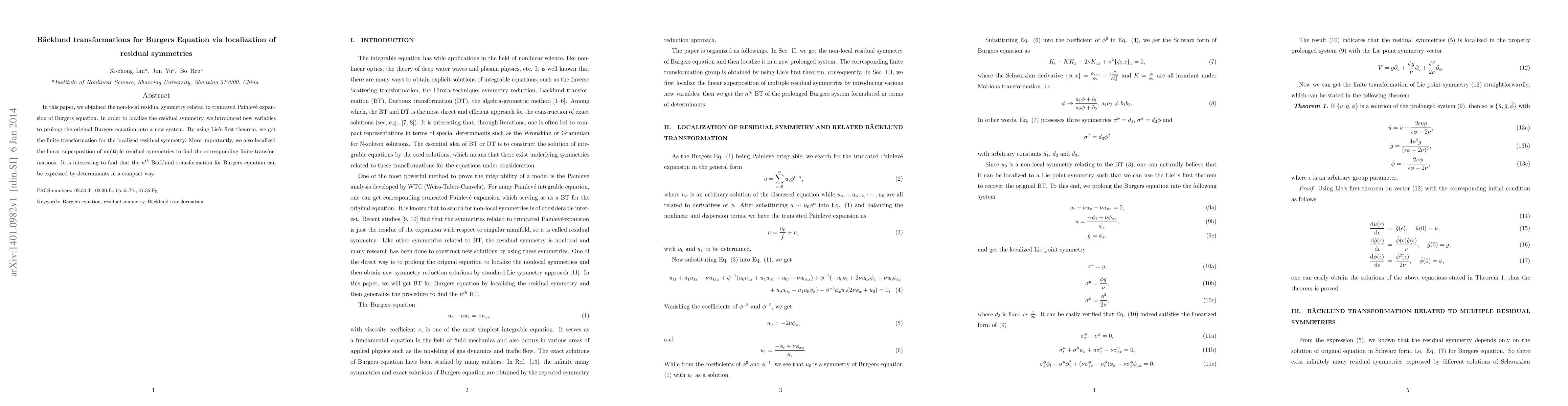 In this paper, we obtained the non-local residual symmetry related to truncated Painlev\'e expansion of Burgers equation. In order to localize the residual symmetry, we introduced new variables to prolong the original Burgers equation into a new system. By using Lie's first theorem, we got the finite transformation for the localized residual symmetry. More importantly, we also localized the linear superposition of multiple residual symmetries to find the corresponding finite transformations. It is interesting to find that the nth Backlund transformation for Burgers equation can be expressed by determinants in a compact way.