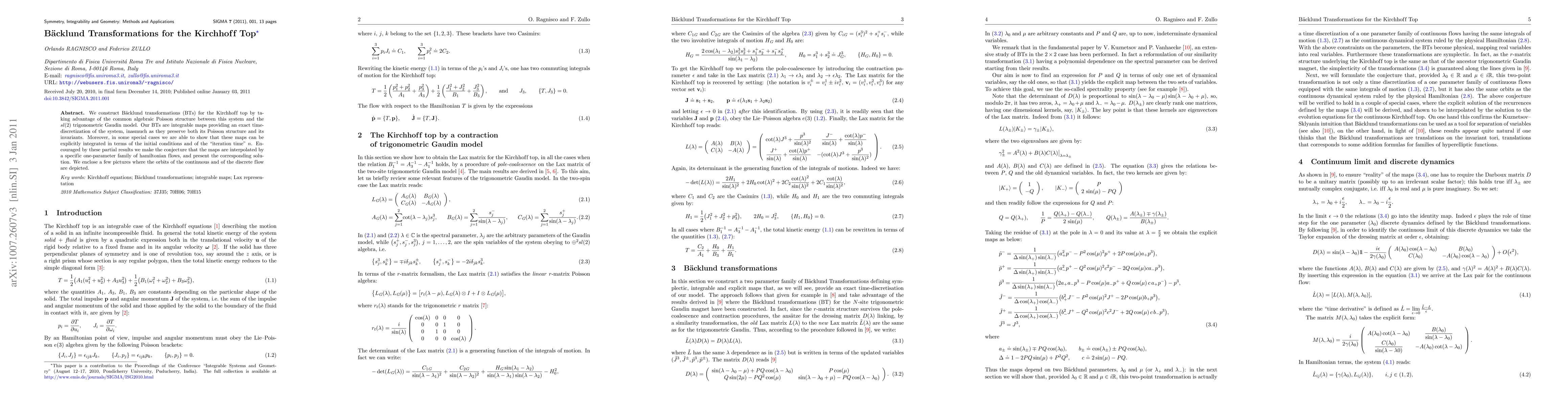 This paper constructs Bäcklund transformations for the Kirchhoff top, leveraging its shared algebraic Poisson structure with the $sl(2)$ trigonometric Gaudin model. These transformations provide an exact time-discretization, preserving the system's invariants and Poisson structure, and are conjectured to be interpolated by a one-parameter family of Hamiltonian flows.