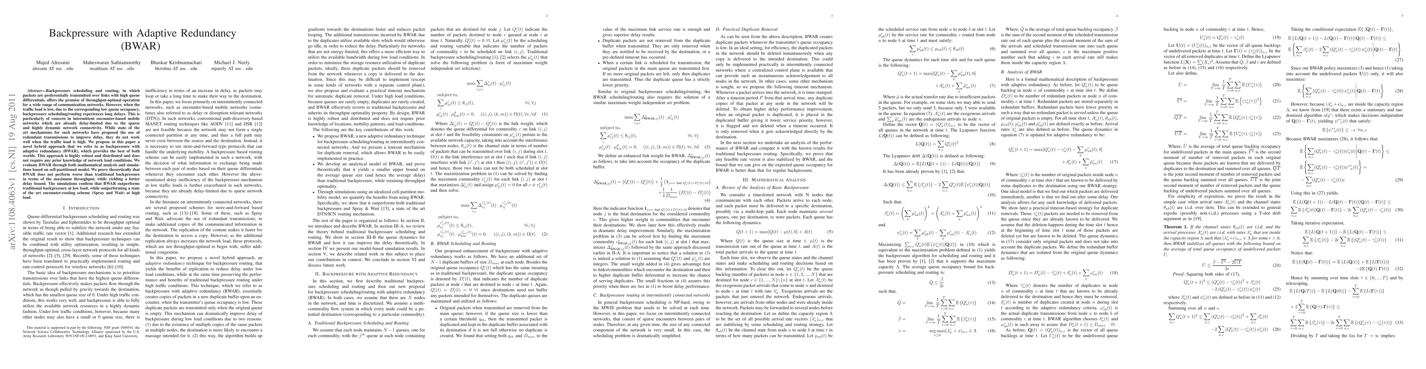 Backpressure scheduling and routing, in which packets are preferentially transmitted over links with high queue differentials, offers the promise of throughput-optimal operation for a wide range of communication networks. However, when the traffic load is low, due to the corresponding low queue occupancy, backpressure scheduling/routing experiences long delays. This is particularly of concern in intermittent encounter-based mobile networks which are already delay-limited due to the sparse and highly dynamic network connectivity. While state of the art mechanisms for such networks have proposed the use of redundant transmissions to improve delay, they do not work well when the traffic load is high. We propose in this paper a novel hybrid approach that we refer to as backpressure with adaptive redundancy (BWAR), which provides the best of both worlds. This approach is highly robust and distributed and does not require any prior knowledge of network load conditions. We evaluate BWAR through both mathematical analysis and simulations based on cell-partitioned model. We prove theoretically that BWAR does not perform worse than traditional backpressure in terms of the maximum throughput, while yielding a better delay bound. The simulations confirm that BWAR outperforms traditional backpressure at low load, while outperforming a state of the art encounter-routing scheme (Spray and Wait) at high load.