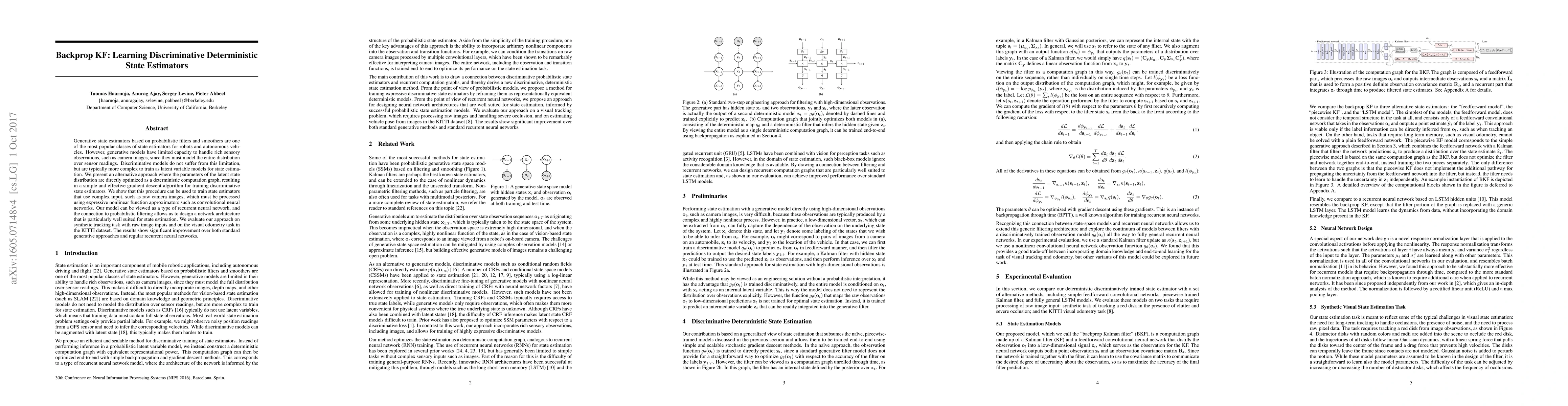 Generative state estimators based on probabilistic filters and smoothers are one of the most popular classes of state estimators for robots and autonomous vehicles. However, generative models have limited capacity to handle rich sensory observations, such as camera images, since they must model the entire distribution over sensor readings. Discriminative models do not suffer from this limitation, but are typically more complex to train as latent variable models for state estimation. We present an alternative approach where the parameters of the latent state distribution are directly optimized as a deterministic computation graph, resulting in a simple and effective gradient descent algorithm for training discriminative state estimators. We show that this procedure can be used to train state estimators that use complex input, such as raw camera images, which must be processed using expressive nonlinear function approximators such as convolutional neural networks. Our model can be viewed as a type of recurrent neural network, and the connection to probabilistic filtering allows us to design a network architecture that is particularly well suited for state estimation. We evaluate our approach on synthetic tracking task with raw image inputs and on the visual odometry task in the KITTI dataset. The results show significant improvement over both standard generative approaches and regular recurrent neural networks.