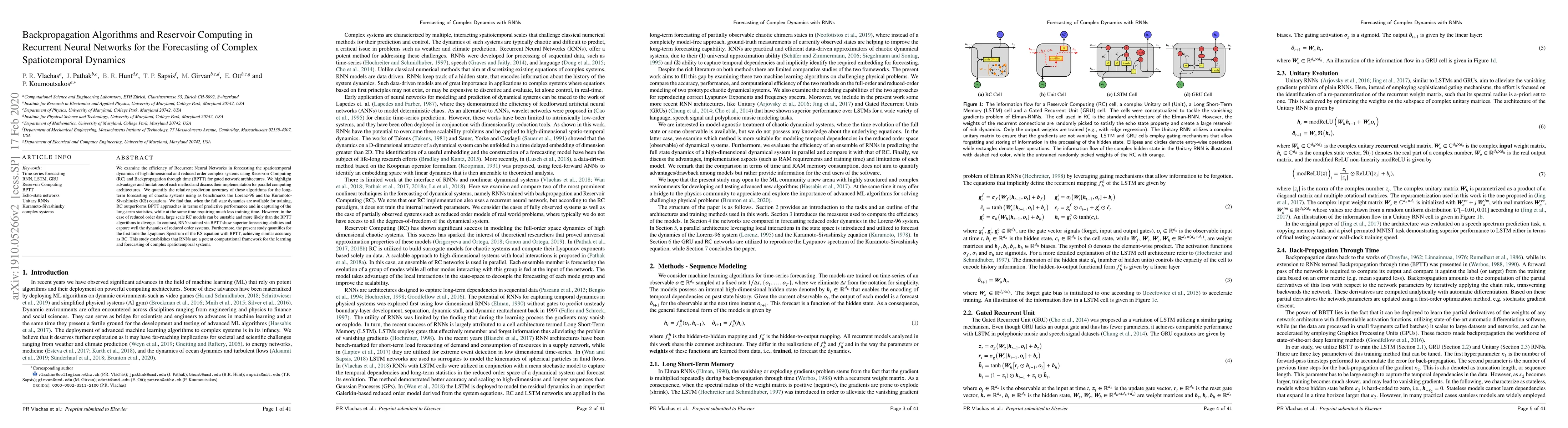 This paper investigates the use of Recurrent Neural Networks (RNNs) with Reservoir Computing (RC) and Backpropagation through time (BPTT) for forecasting complex spatiotemporal dynamics. RC outperforms BPTT in full state dynamics but struggles with reduced order data, while BPTT excels in forecasting reduced order systems. The study highlights RNNs as a powerful tool for complex system forecasting.