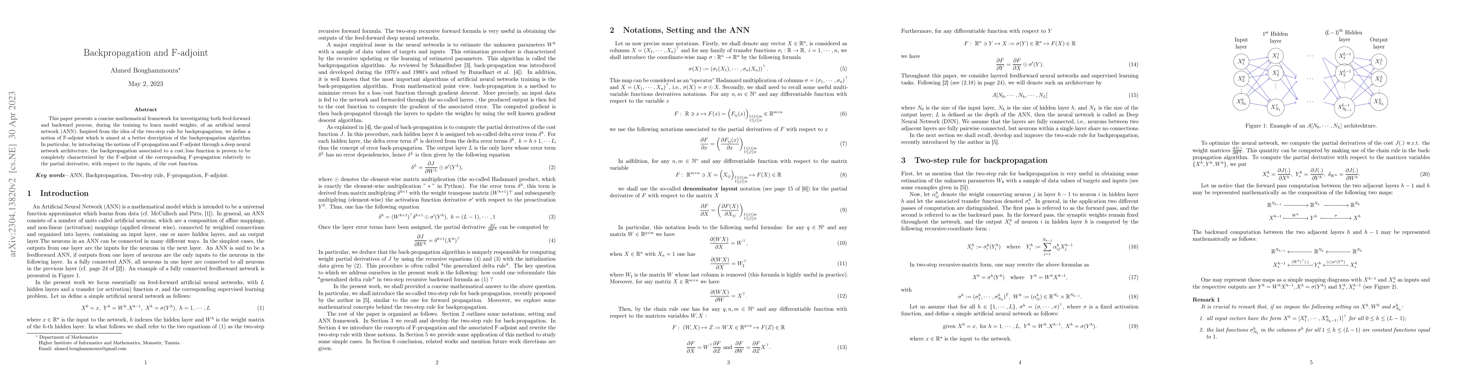 This paper presents a concise mathematical framework for investigating both feed-forward and backward process, during the training to learn model weights, of an artificial neural network (ANN). Inspired from the idea of the two-step rule for backpropagation, we define a notion of F-adjoint which is aimed at a better description of the backpropagation algorithm. In particular, by introducing the notions of F-propagation and F-adjoint through a deep neural network architecture, the backpropagation associated to a cost/loss function is proven to be completely characterized by the F-adjoint of the corresponding F-propagation relatively to the partial derivative, with respect to the inputs, of the cost function.