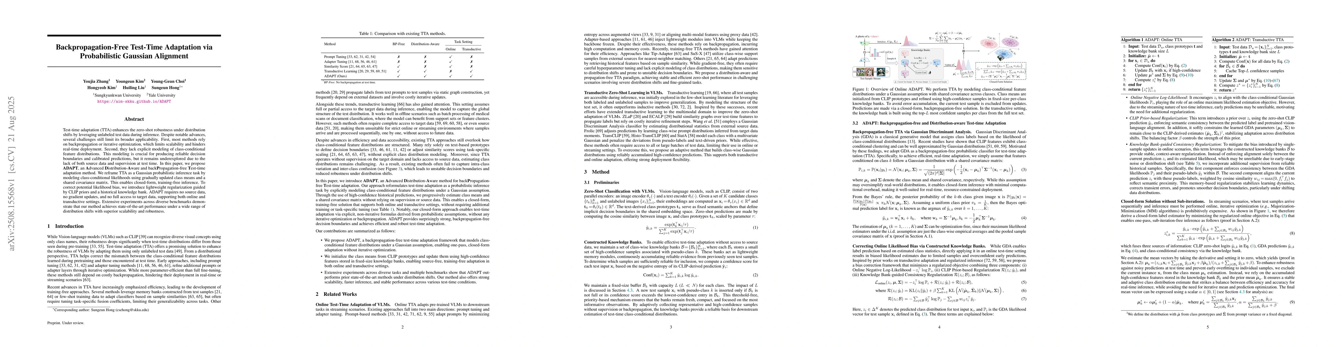 Test-time adaptation (TTA) enhances the zero-shot robustness under distribution shifts by leveraging unlabeled test data during inference. Despite notable advances, several challenges still limit its broader applicability. First, most methods rely on backpropagation or iterative optimization, which limits scalability and hinders real-time deployment. Second, they lack explicit modeling of class-conditional feature distributions. This modeling is crucial for producing reliable decision boundaries and calibrated predictions, but it remains underexplored due to the lack of both source data and supervision at test time. In this paper, we propose ADAPT, an Advanced Distribution-Aware and backPropagation-free Test-time adaptation method. We reframe TTA as a Gaussian probabilistic inference task by modeling class-conditional likelihoods using gradually updated class means and a shared covariance matrix. This enables closed-form, training-free inference. To correct potential likelihood bias, we introduce lightweight regularization guided by CLIP priors and a historical knowledge bank. ADAPT requires no source data, no gradient updates, and no full access to target data, supporting both online and transductive settings. Extensive experiments across diverse benchmarks demonstrate that our method achieves state-of-the-art performance under a wide range of distribution shifts with superior scalability and robustness.