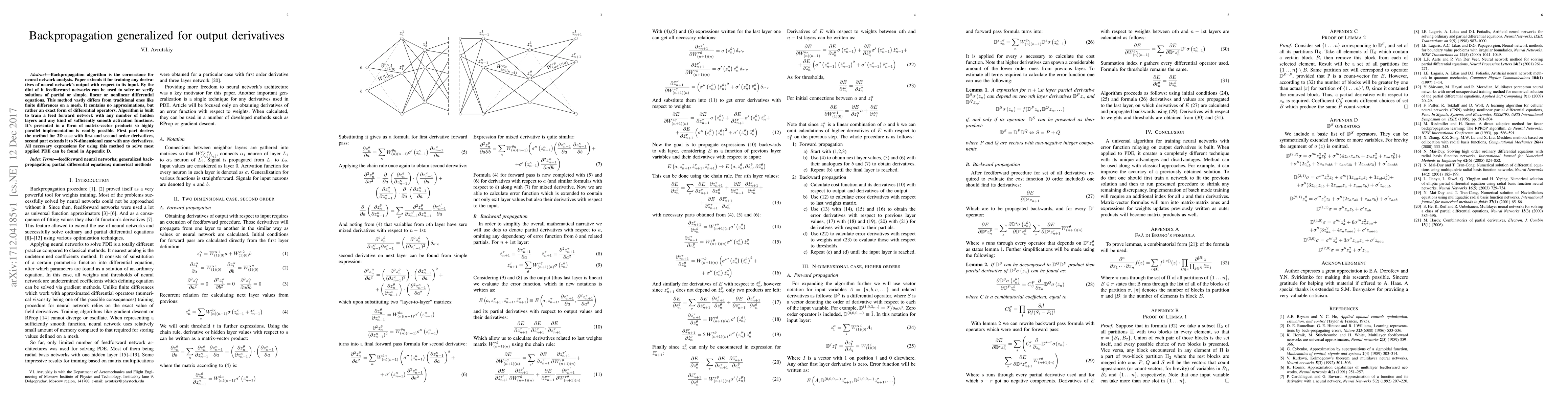 Backpropagation algorithm is the cornerstone for neural network analysis. Paper extends it for training any derivatives of neural network's output with respect to its input. By the dint of it feedforward networks can be used to solve or verify solutions of partial or simple, linear or nonlinear differential equations. This method vastly differs from traditional ones like finite differences on a mesh. It contains no approximations, but rather an exact form of differential operators. Algorithm is built to train a feed forward network with any number of hidden layers and any kind of sufficiently smooth activation functions. It's presented in a form of matrix-vector products so highly parallel implementation is readily possible. First part derives the method for 2D case with first and second order derivatives, second part extends it to N-dimensional case with any derivatives. All necessary expressions for using this method to solve most applied PDE can be found in Appendix D.