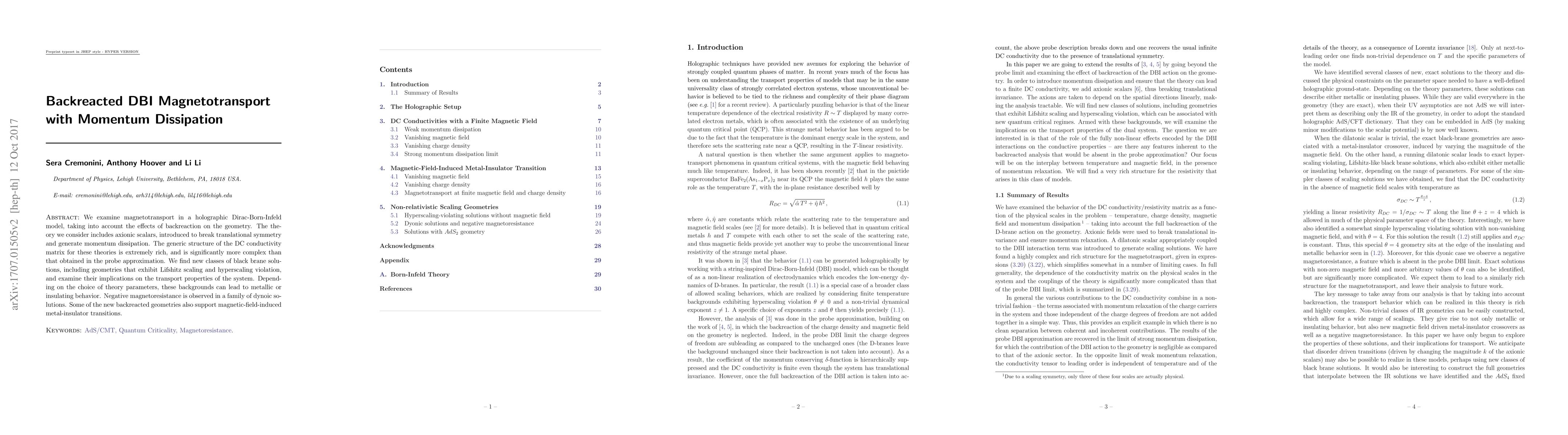 Researchers investigated magnetotransport in a holographic Dirac-Born-Infeld model with backreaction on geometry, discovering new classes of black brane solutions that can lead to metallic or insulating behavior and magnetic-field-induced metal-insulator transitions.