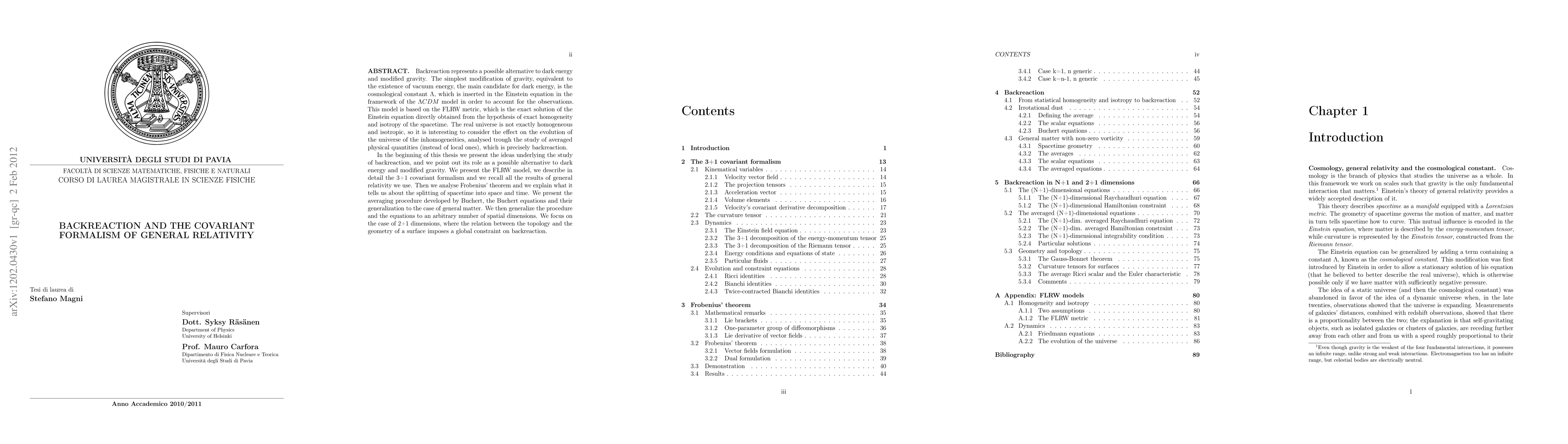 This thesis is a review of backreaction, which is a possible alternative to dark energy and modified gravity. We describe in detail the 3+1 covariant formalism and Frobenius' theorem. We present the averaging procedure developed by Buchert, the Buchert equations and the generalization of these equations to the case of general matter. We then generalize to arbitrary number of spatial dimensions. We focus on the case of 2+1 dimensions, where the relation between the topology and the geometry of a surface imposes a global constraint on backreaction.