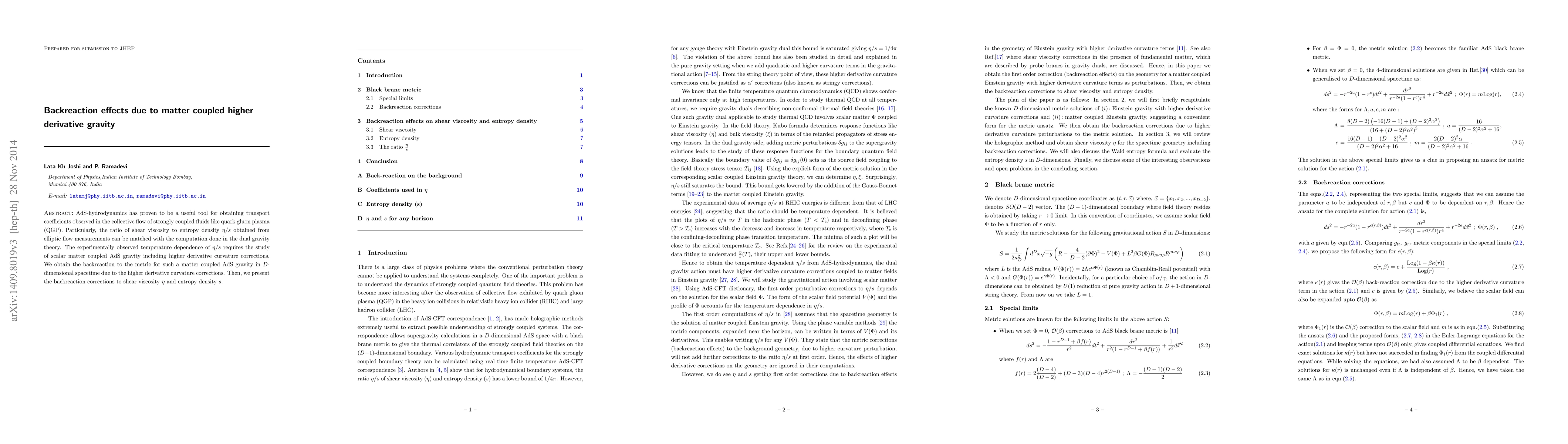 AdS-hydrodynamics has proven to be a useful tool for obtaining transport coefficients observed in the collective flow of strongly coupled fluids like quark gluon plasma (QGP). Particularly, the ratio of shear viscosity to entropy density ${\eta/ s}$ obtained from elliptic flow measurements can be matched with the computation done in the dual gravity theory. The experimentally observed temperature dependence of ${\eta/ s}$ requires the study of scalar matter coupled AdS gravity including higher derivative curvature corrections. We obtain the backreaction to the metric for such a matter coupled AdS gravity in $D$-dimensional spacetime due to the higher derivative curvature corrections. Then, we present the backreaction corrections to shear-viscosity $\eta$ and entropy density $s$.
