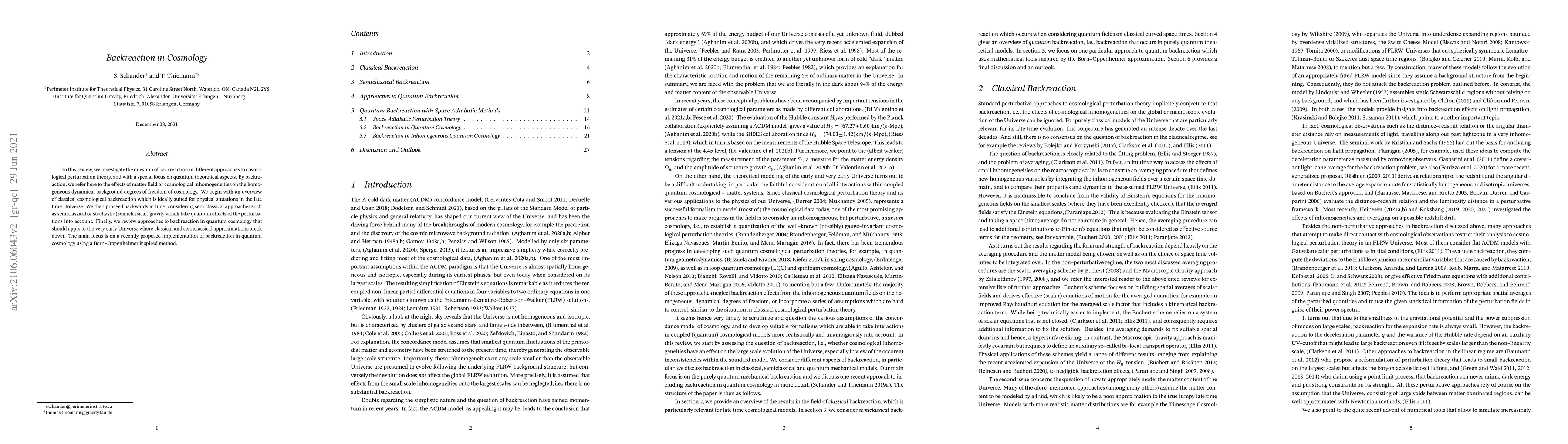 This paper reviews backreaction in cosmological perturbation theory, focusing on how matter field inhomogeneities affect the homogeneous background. It discusses classical, semiclassical, and quantum approaches, with a special emphasis on a novel Born-Oppenheimer inspired method for quantum cosmology.