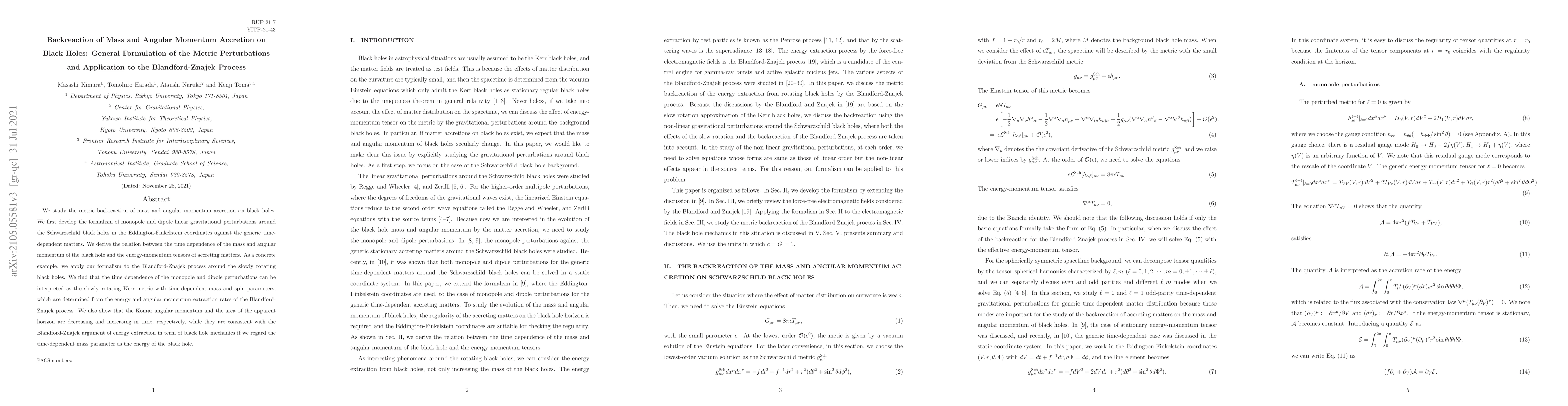 This paper develops a formalism for linear gravitational perturbations around Schwarzschild black holes due to mass and angular momentum accretion, applying it to the Blandford-Znajek process. It finds that the perturbations correspond to a time-dependent Kerr metric, with mass and spin parameters linked to energy and angular momentum extraction rates.