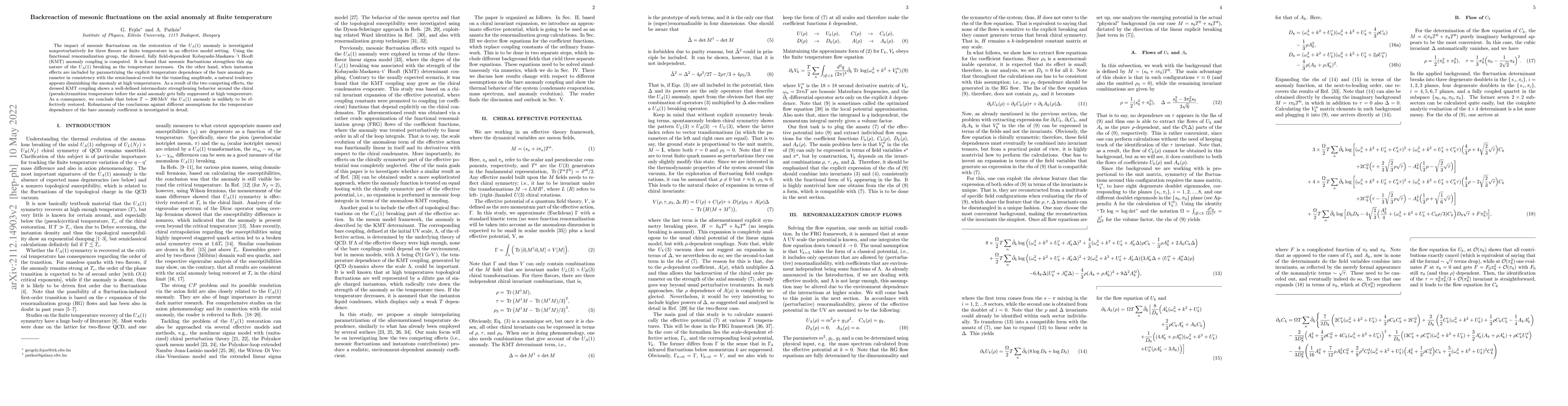 The impact of mesonic fluctuations on the restoration of the $U_A(1)$ anomaly is investigated nonperturbatively for three flavors at finite temperature in an effective model setting. Using the functional renormalization group, the dressed, fully field-dependent Kobayashi-Maskawa--'t Hooft (KMT) anomaly coupling is computed. It is found that mesonic fluctuations strengthen this signature of the $U_A(1)$ breaking as the temperature increases. On the other hand, when instanton effects are included by parametrizing the explicit temperature dependence of the bare anomaly parameter in consistency with the semiclassical result for the tunneling amplitude, a natural tendency appears diminishing the anomaly at high temperatures. As a result of the two competing effects, the dressed KMT coupling shows a well-defined intermediate strengthening behavior around the chiral (pseudo)transition temperature before the axial anomaly gets fully suppressed at high temperature. As a consequence, we conclude that below $T \sim 200 \MeV$ the $U_A(1)$ anomaly is unlikely to be effectively restored. Robustness of the conclusions against different assumptions for the temperature dependence of the bare anomaly coefficient is investigated in detail.