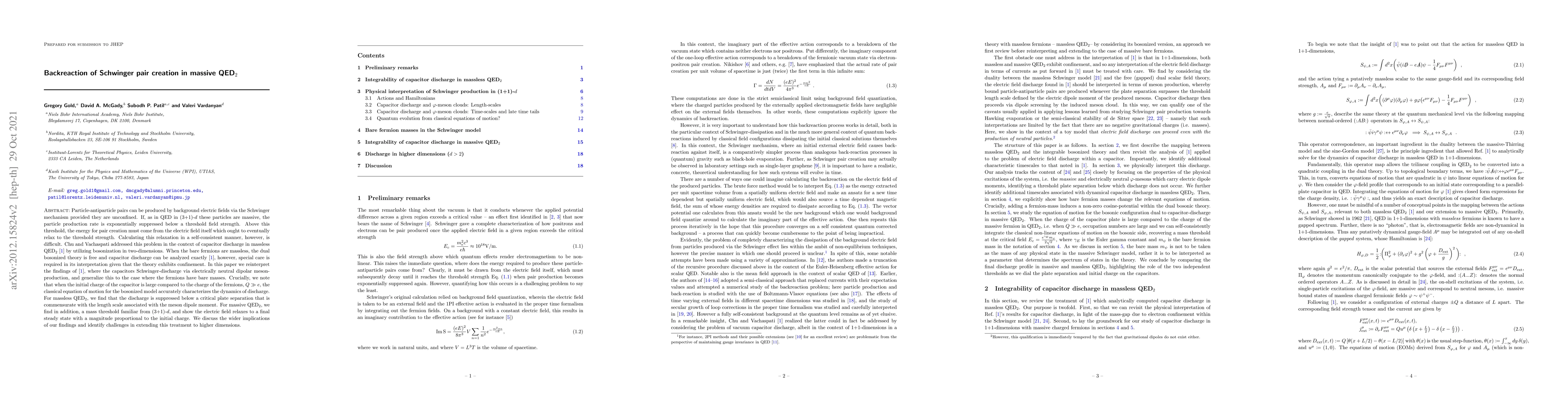 This paper investigates the Schwinger pair creation in massive QED$_2$ and its backreaction on the background electric field, showing that the field relaxes to a steady state proportional to the initial charge when the fermions have bare masses. It reinterprets previous results for massless QED$_2$ and extends the analysis to massive fermions, highlighting the implications for capacitor discharge dynamics.